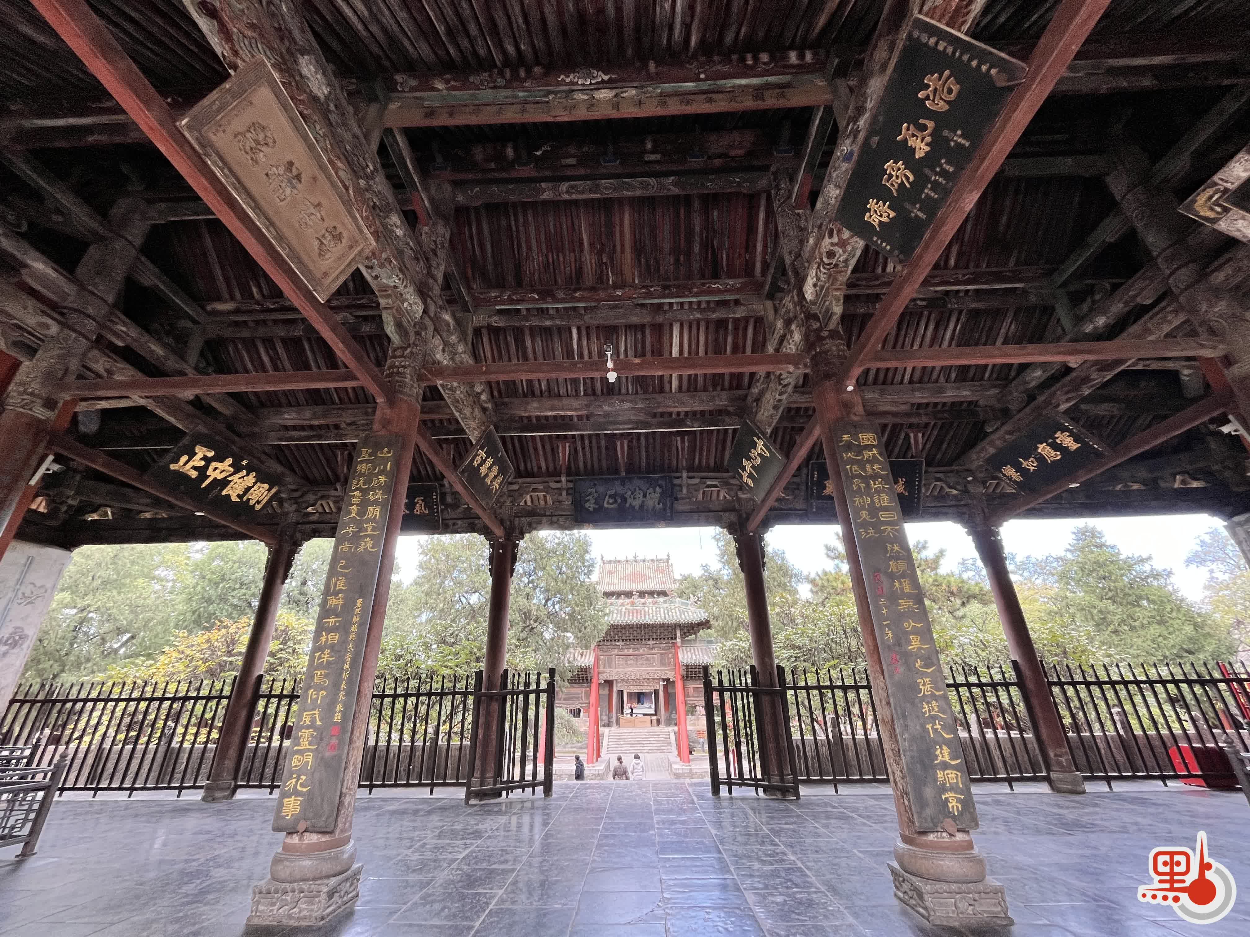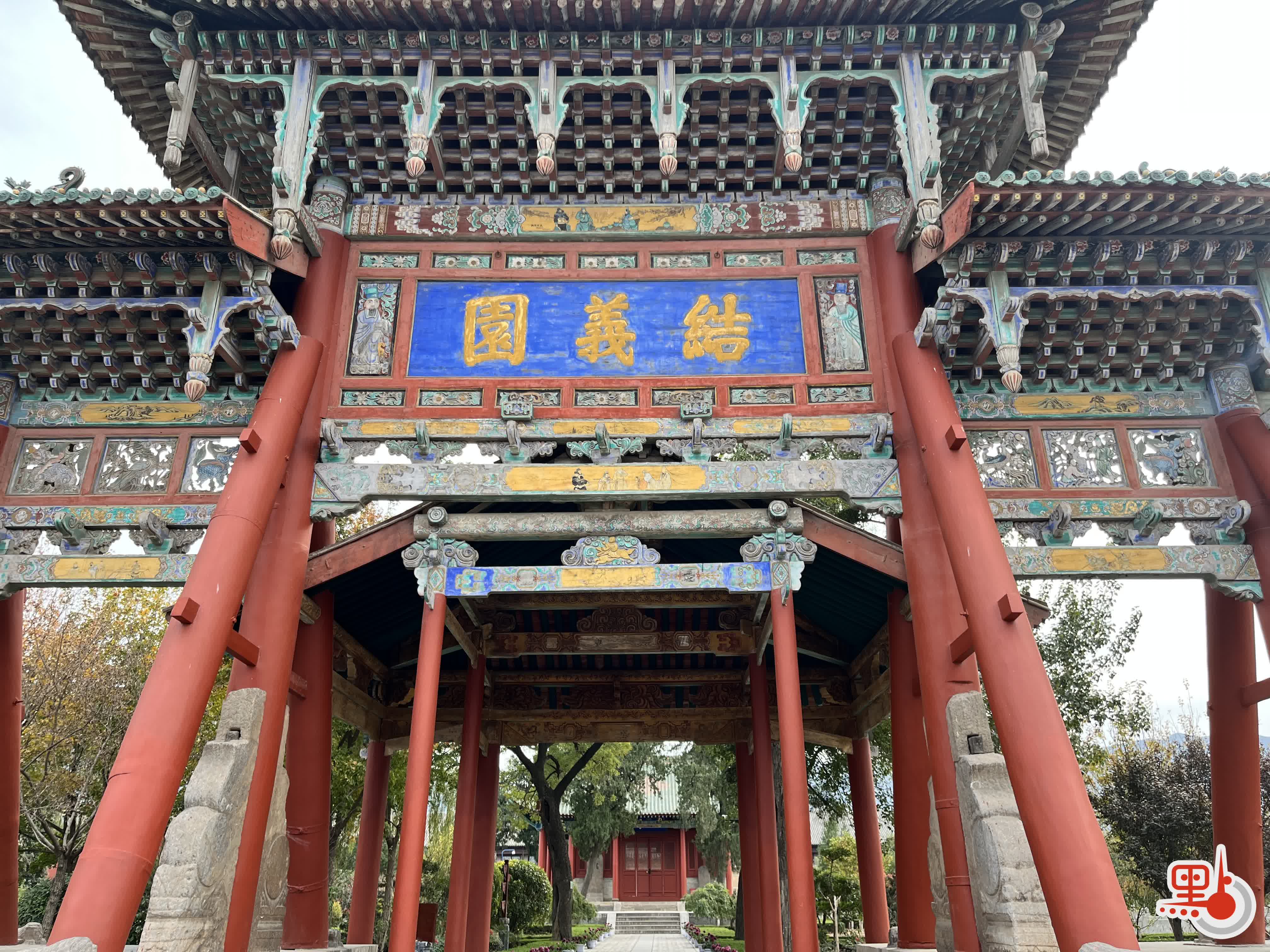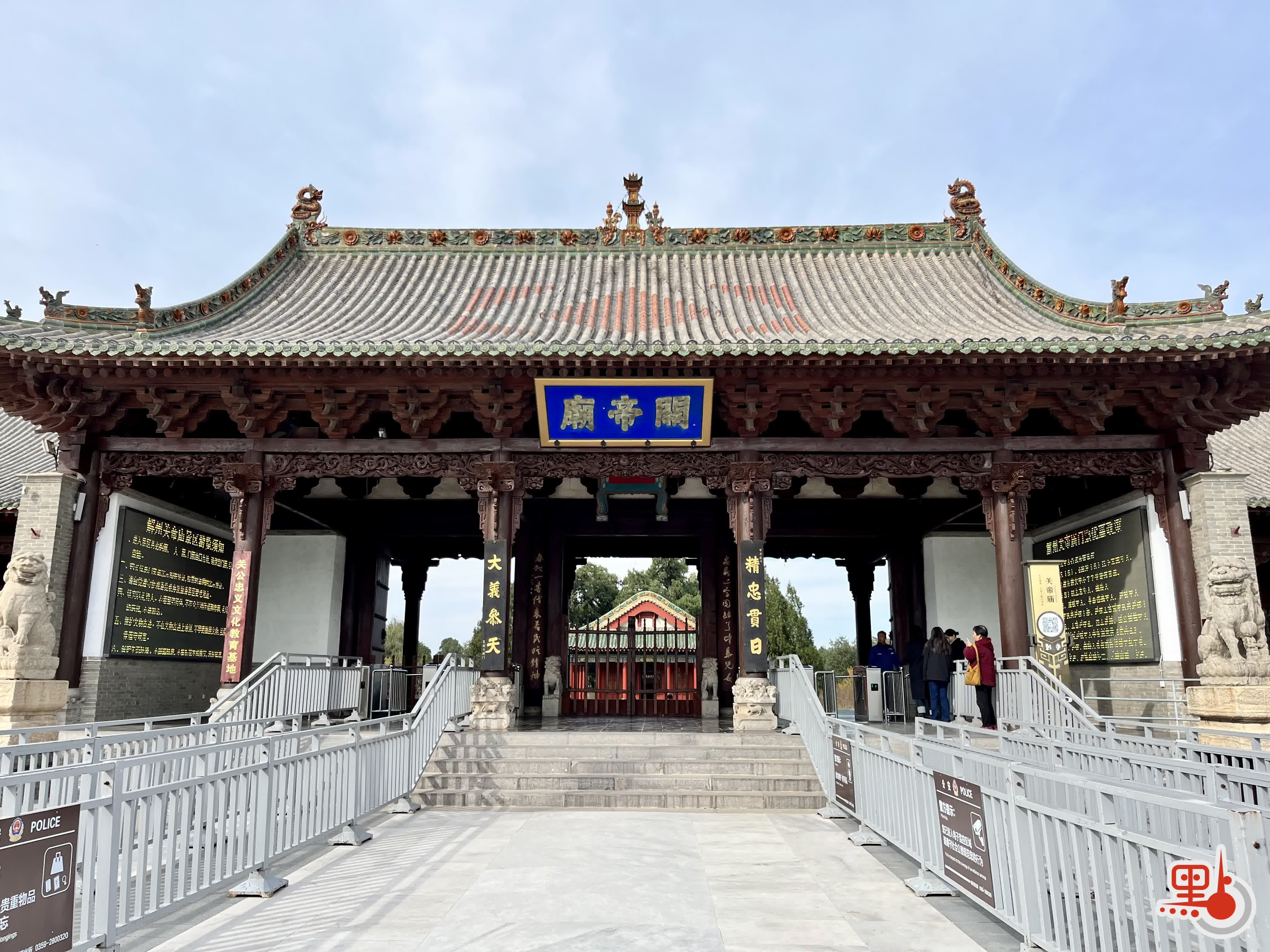 這裏不愧是「武廟之祖」,格局之宏大,佔地之寬,堪比31個足球場那麼大。從南門入,首先看到的是結義園,明萬曆年間的牌坊在多年的日曬下已經斑駁泛白。穿過端門、雉門、午門,只見古柏參天。能擁有這三道大門,是因為明朝皇帝把關公的地位提升至關聖帝君,與孔子並列。也只有帝王之尊,才有這種待遇。