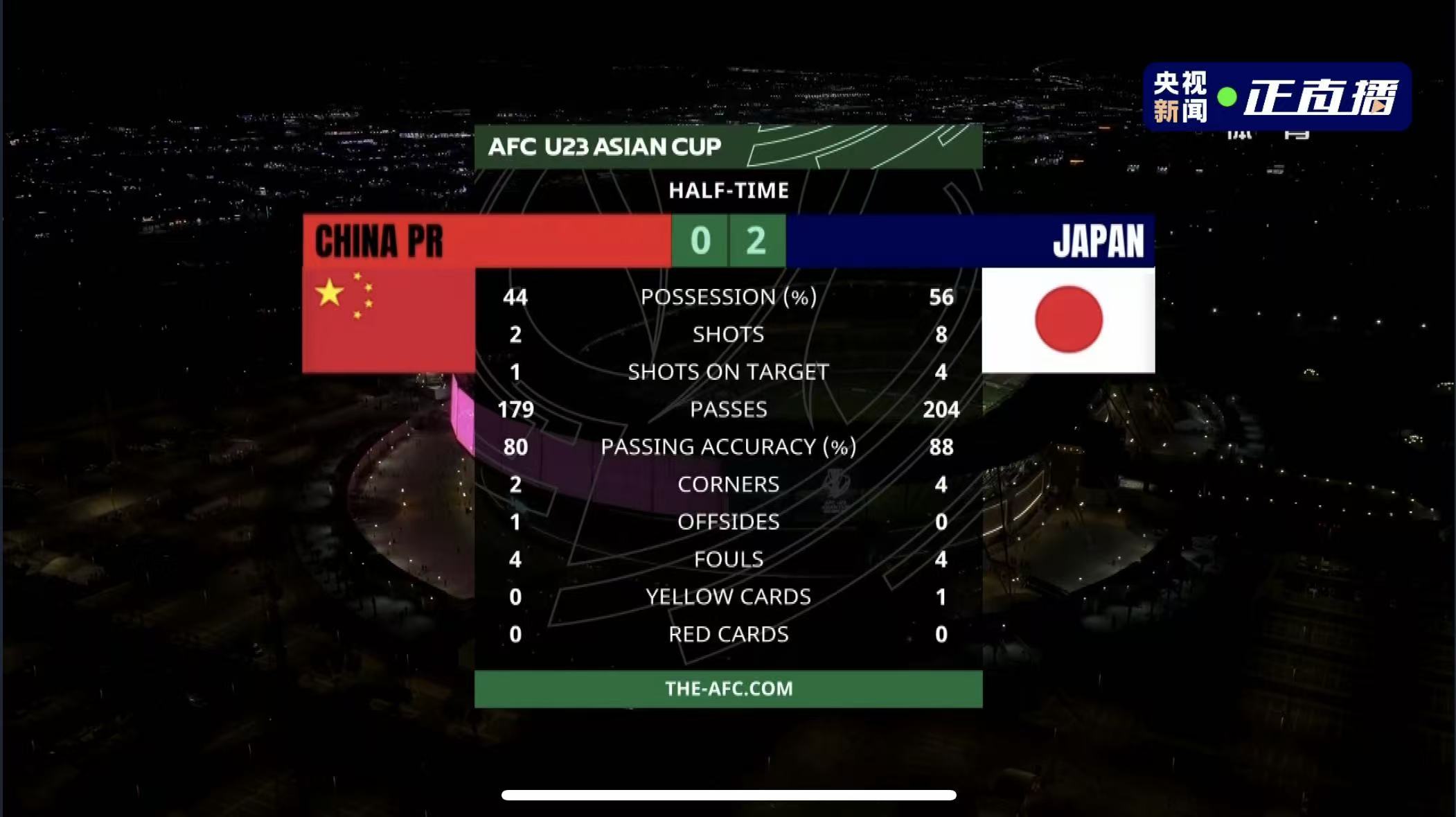 上半場比賽結束,大關友翔、小倉幸成各入一球,中國隊暫時0比2落後日本隊。