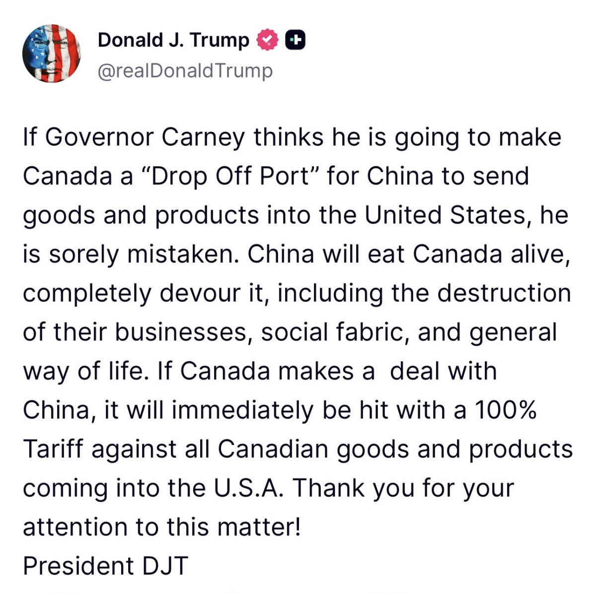 特朗普在其個人社交平台Truth Social上發文,並以「州長卡尼」稱呼加拿大總理卡尼。他在文中稱,若卡尼試圖將加拿大作為「轉運港」,讓中國貨物和產品經加拿大進入美國,那將是「極大錯誤」。