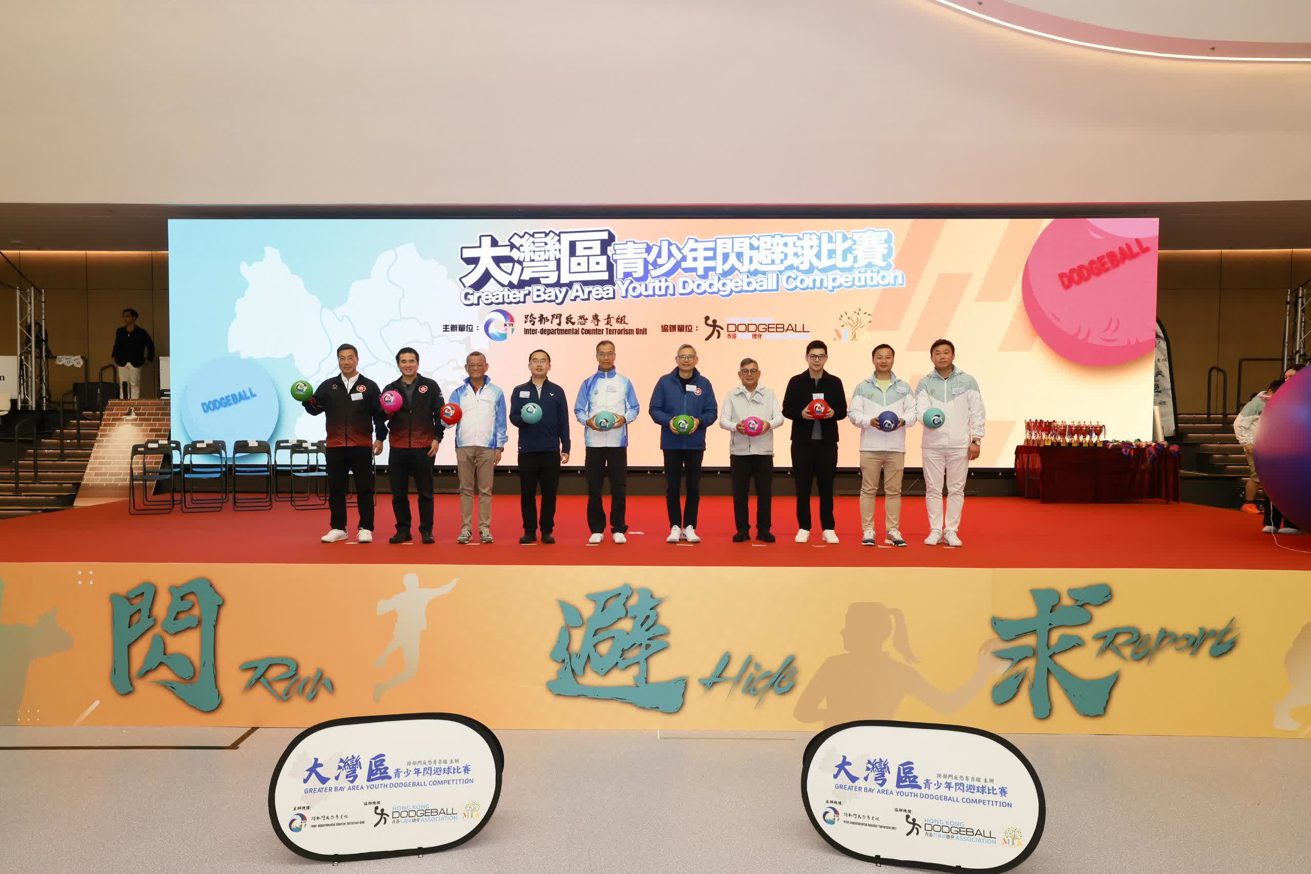 保安局副局長卓孝業、警務處副處長(行動)葉雲龍及一眾協辦機構的主禮嘉賓,為大灣區交流賽主持開球禮及頒獎儀式。