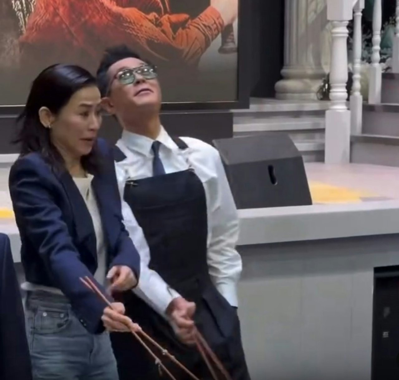 原先各人只要拿起筷子,輕起「撈起」拍照便完成,不過古老闆似乎撈得興起,愈撈愈高,突然有一箸菜撈至拋上半空,嚇到身旁的宣萱花容失色慘叫,怕被菜絲波及,但結果是古生自己「中頭獎」。隨後他更拿起另一箸,作狀向觀眾「送上」。