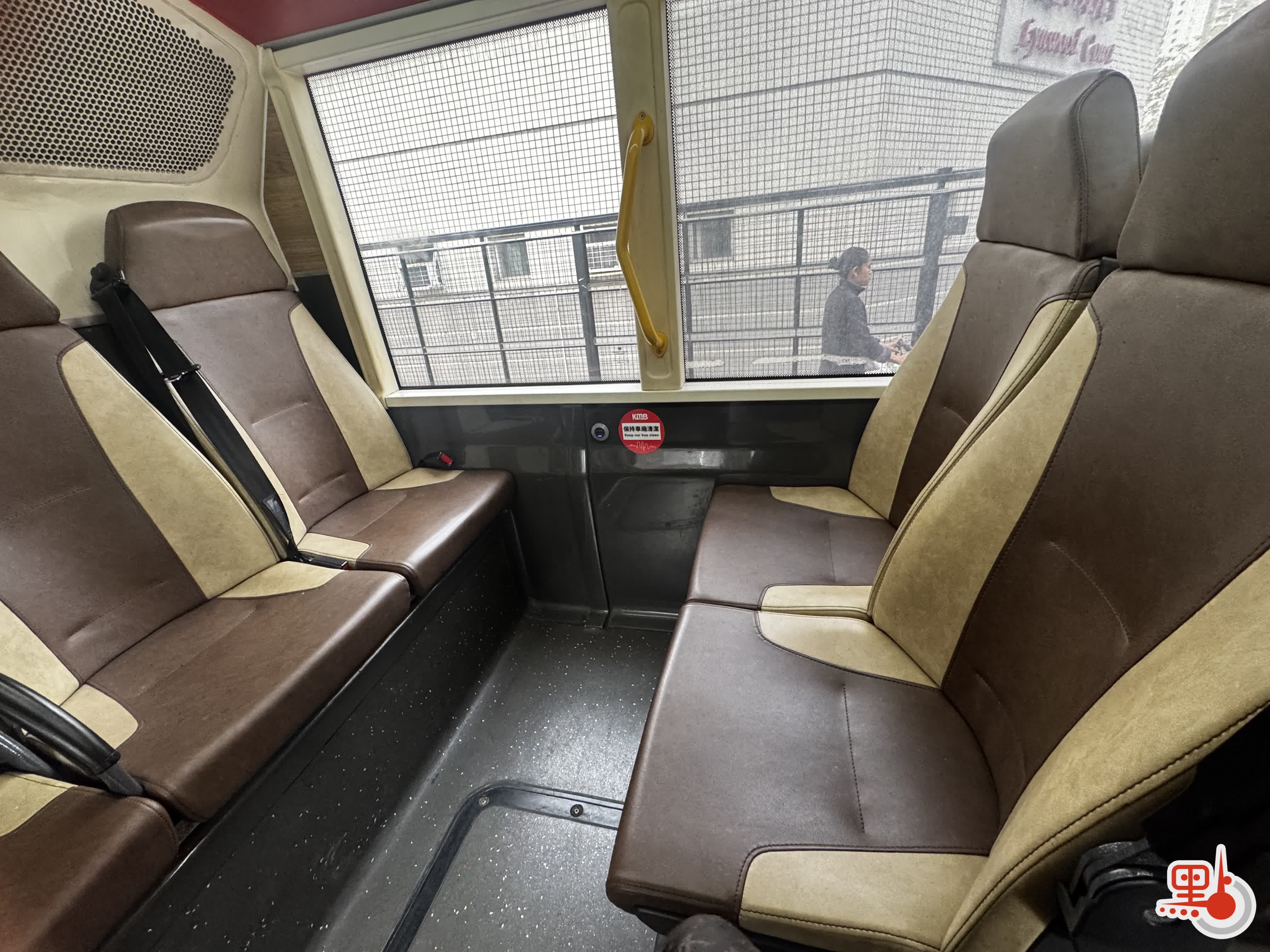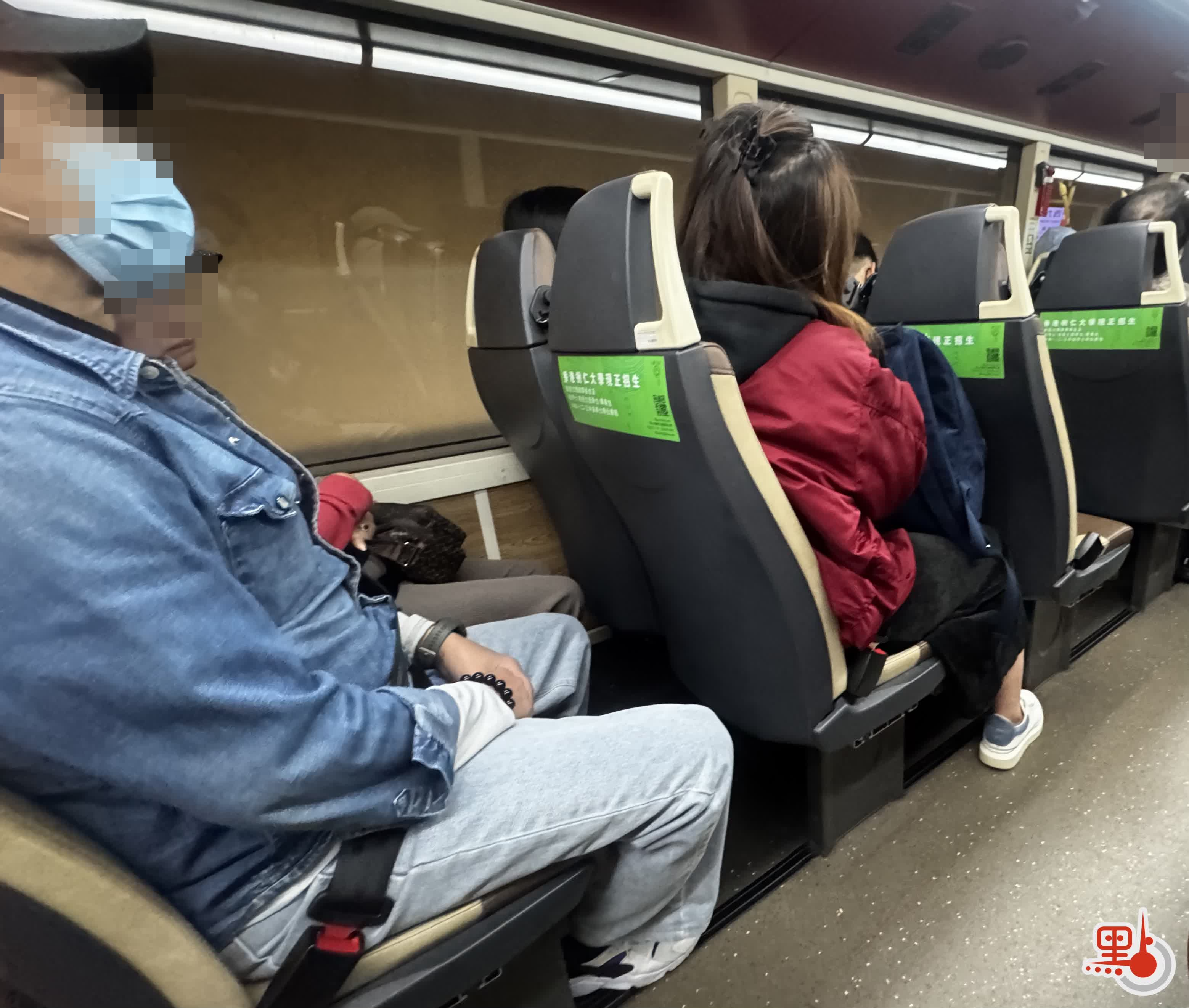 這輛雙層巴士的下層只有最後一排和前排少量座位配備了安全帶,而上層所有座位都有。粗略看下來,超過一半坐在上層的乘客都已經佩戴安全帶,但仍有將近一半的人還沒佩戴。
