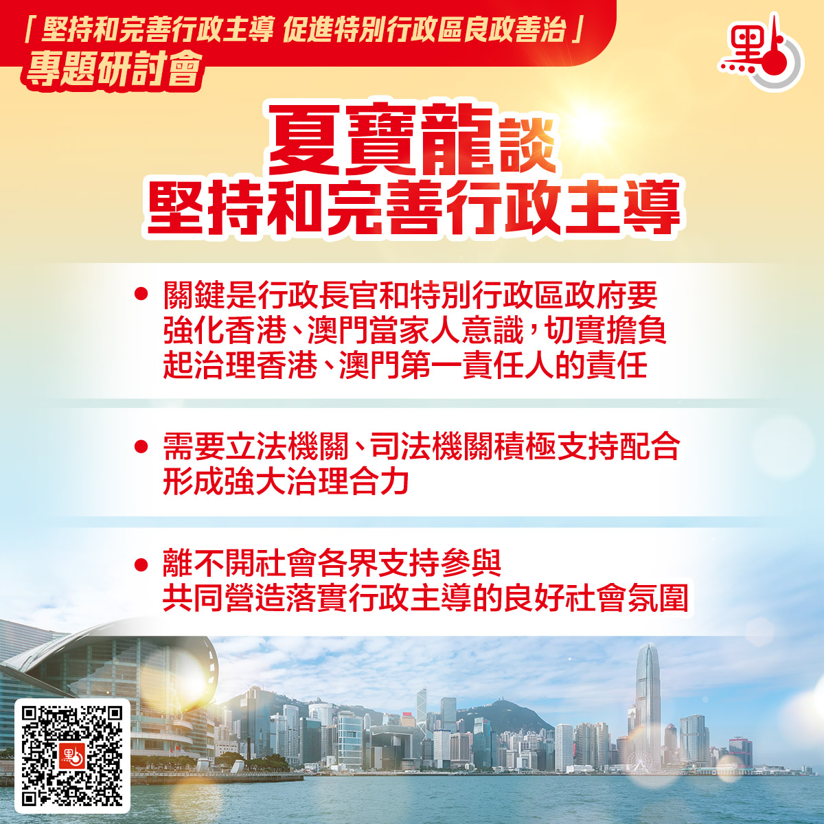 夏寶龍續指,堅持和完善行政主導,離不開社會各界支持參與,共同營造落實行政主導的良好社會氛圍。行政主導要落實到位,歸根到底有賴香港、澳門社會各界和廣大市民的大力支持和共同努力。香港、澳門是全體市民的共同家園,每位市民都是持份者、建設者、受益者。大家都要為了這個家,增強主人翁意識,立足自身崗位積極支持特別行政區政府依法施政,為促進香港、澳門長期繁榮穩定作出自己應有的貢獻。
