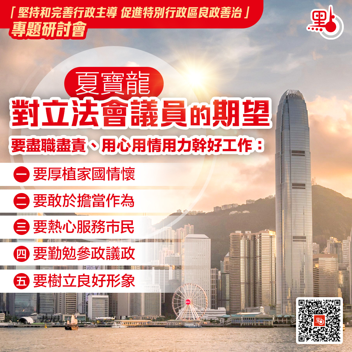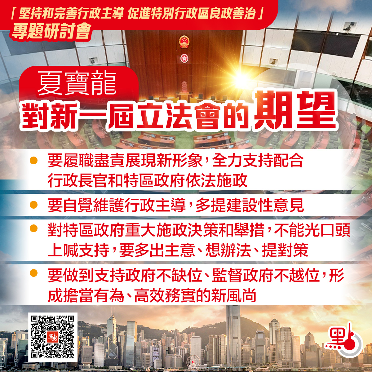 【點新聞報道】1月26日上午,全國港澳研究會在北京舉行「堅持和完善行政主導 促進特別行政區良政善治」專題研討會,中共中央港澳工作辦公室、國務院港澳事務辦公室主任夏寶龍出席研討會並致辭,對新一屆立法會議員提出要求,希望所有立法會議員都要盡職盡責、用心用情用力幹好工作,展現出新一屆立法會議員的風采。
