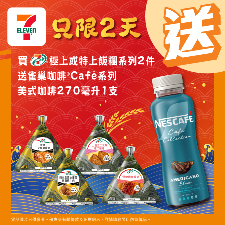 【點新聞報道】7-Eleven再推限時優惠!今個星期一至二(1月26日至27日),在7-Eleven購買7-SELECT極上飯糰系列兩件,即送雀巢咖啡系列美式咖啡(270毫升)。