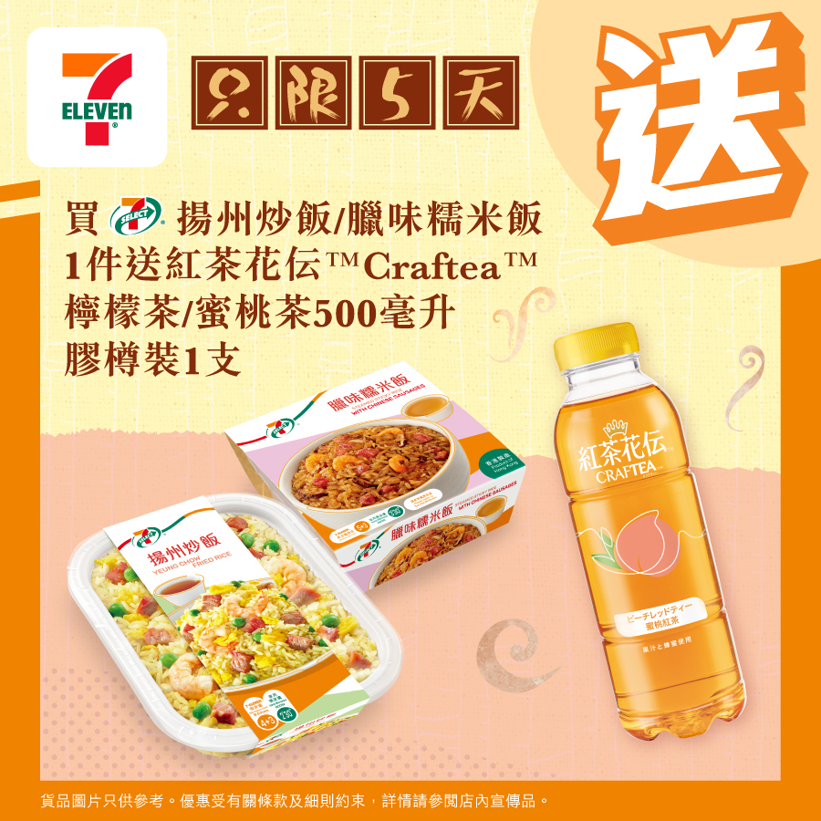 1月26日至30日,於7-Eleven購買7-SELECT揚州炒飯/臘味糯米飯1件,即可獲贈紅茶花伝檸檬茶/蜜桃茶500毫升膠樽裝1支。