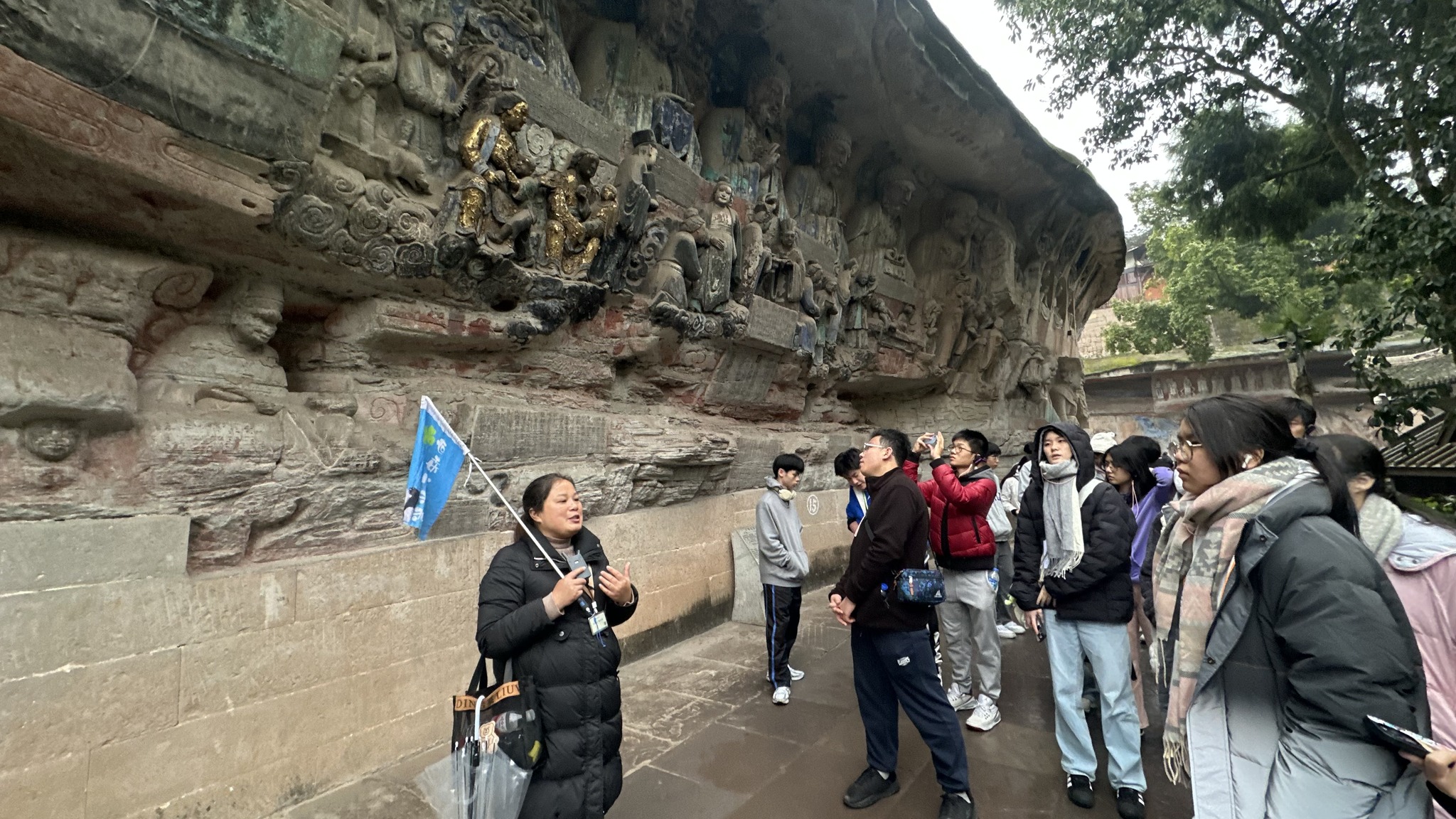 隨後,考察團乘搭高鐵前往大足,參訪世界文化遺產——大足石刻。在導賞員的專業講解下,學生們細心觀察石刻上的精美造型,學習唐宋時期的石刻藝術及其背後的宗教與社會價值。