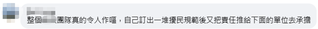 有Facebook專頁對此發文表示,真正該阻擋的是政客。亦有網民在該帖文評論區留言說,「整個『執政』團隊真的令人作嘔,自己定出一堆擾民規範後,又把責任推給下面的單位去承擔」。