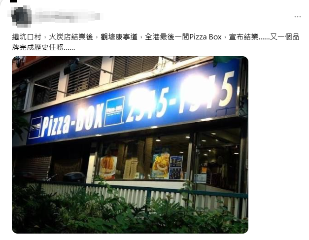 【點新聞報道】連鎖美式薄餅店「Pizza-BOX」近日全線結業。有網民在Threads發文指,位於觀塘康寧道的「全港最後一間」Pizza-BOX分店正式結業,亦有指其網頁已無法運作,電話接駁至留言信箱。Pizza-BOX正式結束其在港23年營運,不少網民表示惋惜。