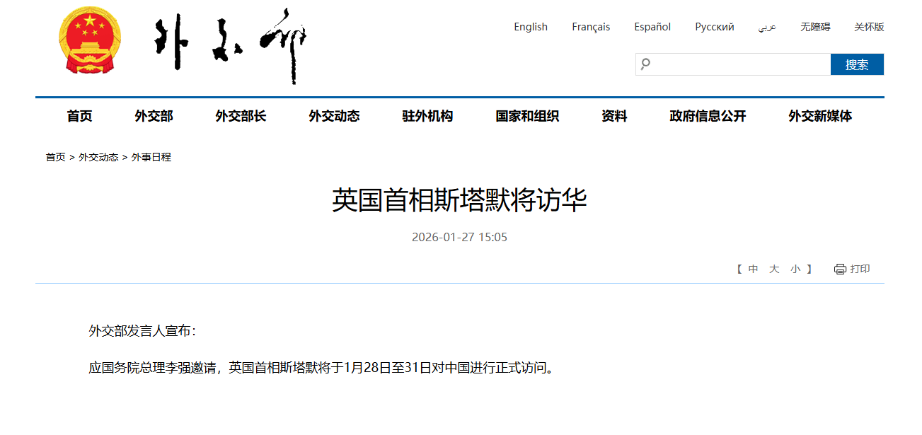 【點新聞報道】據外交部官方網站消息,外交部發言人今日(27日)宣布,應國務院總理李強邀請,英國首相斯塔默將於1月28日至31日對中國進行正式訪問。