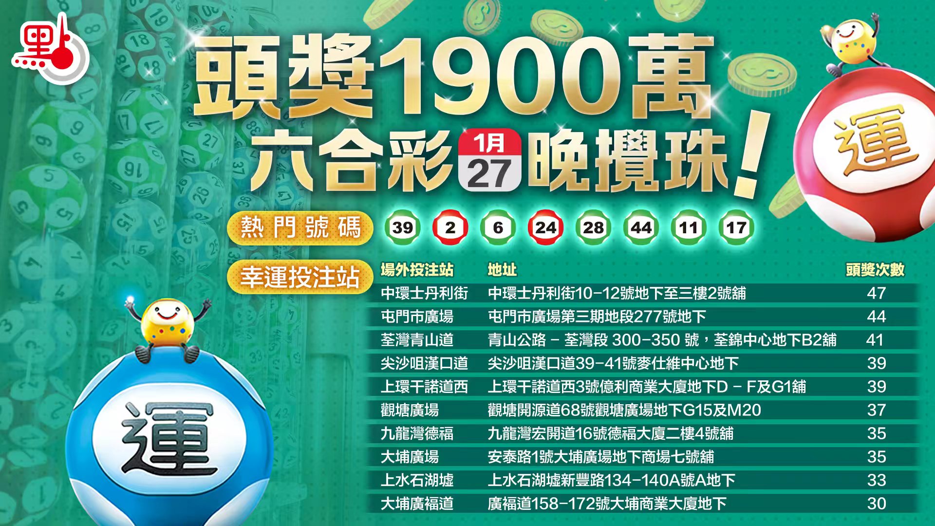 至於10大幸運投注站。截至2025年6月30日,分別為是位於中環士丹利街、屯門市廣場、荃灣青山道、尖沙咀漢口道、上環干諾道西、觀塘廣場、九龍灣德褔、大埔廣場、上水石湖墟、及大埔廣褔道。