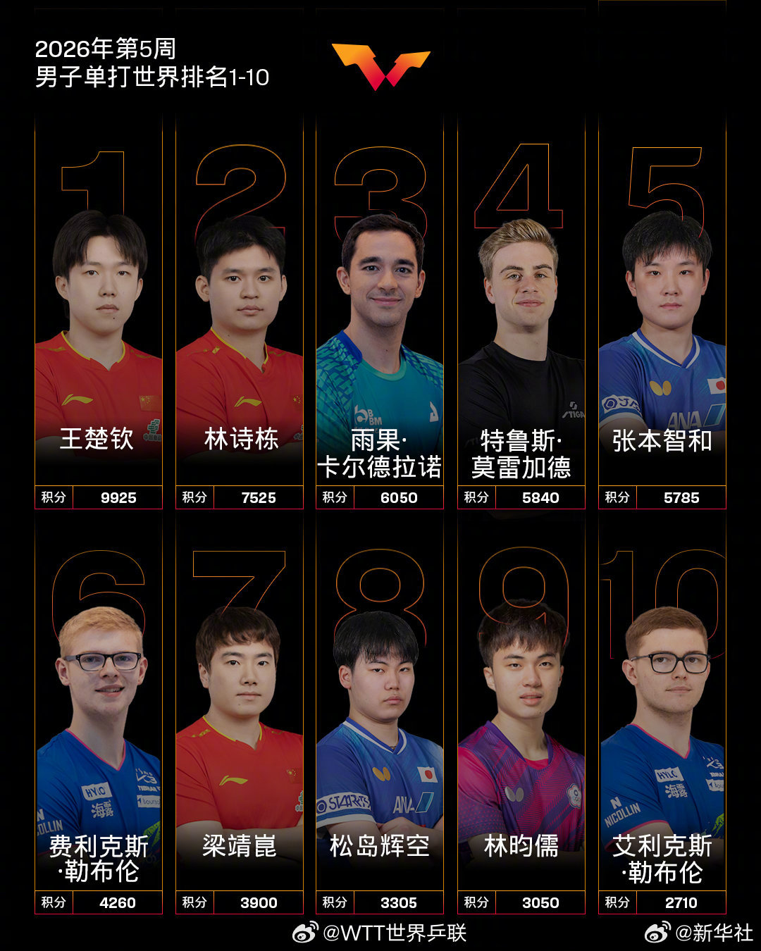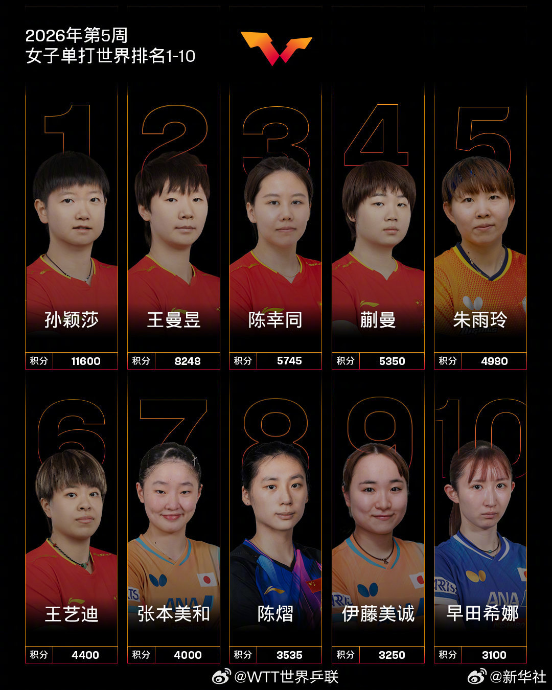 王楚欽孫穎莎續領跑WTT冠軍榜 國家隊包攬女單世排前五