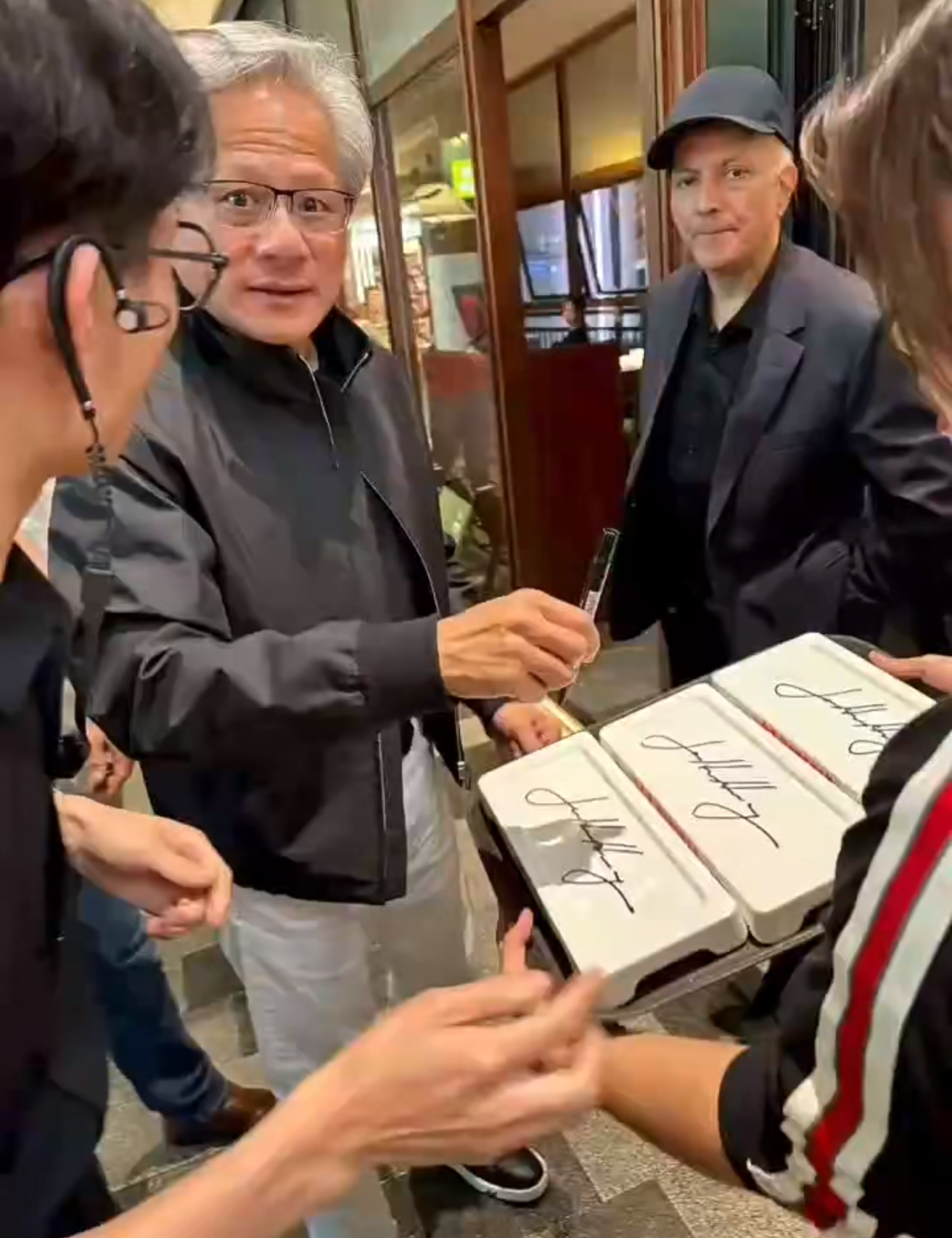 據悉,7人僅消費800餘元,門店的工作人員介紹,黃仁勳一行人在臨走時,還爽快答應了員工的合影邀請,並在餐盤上簽名。