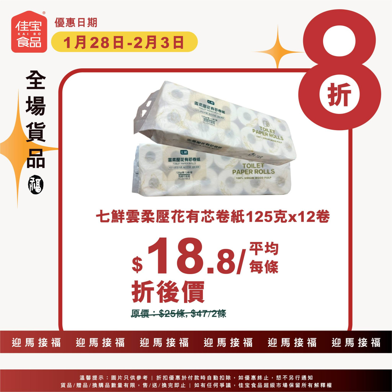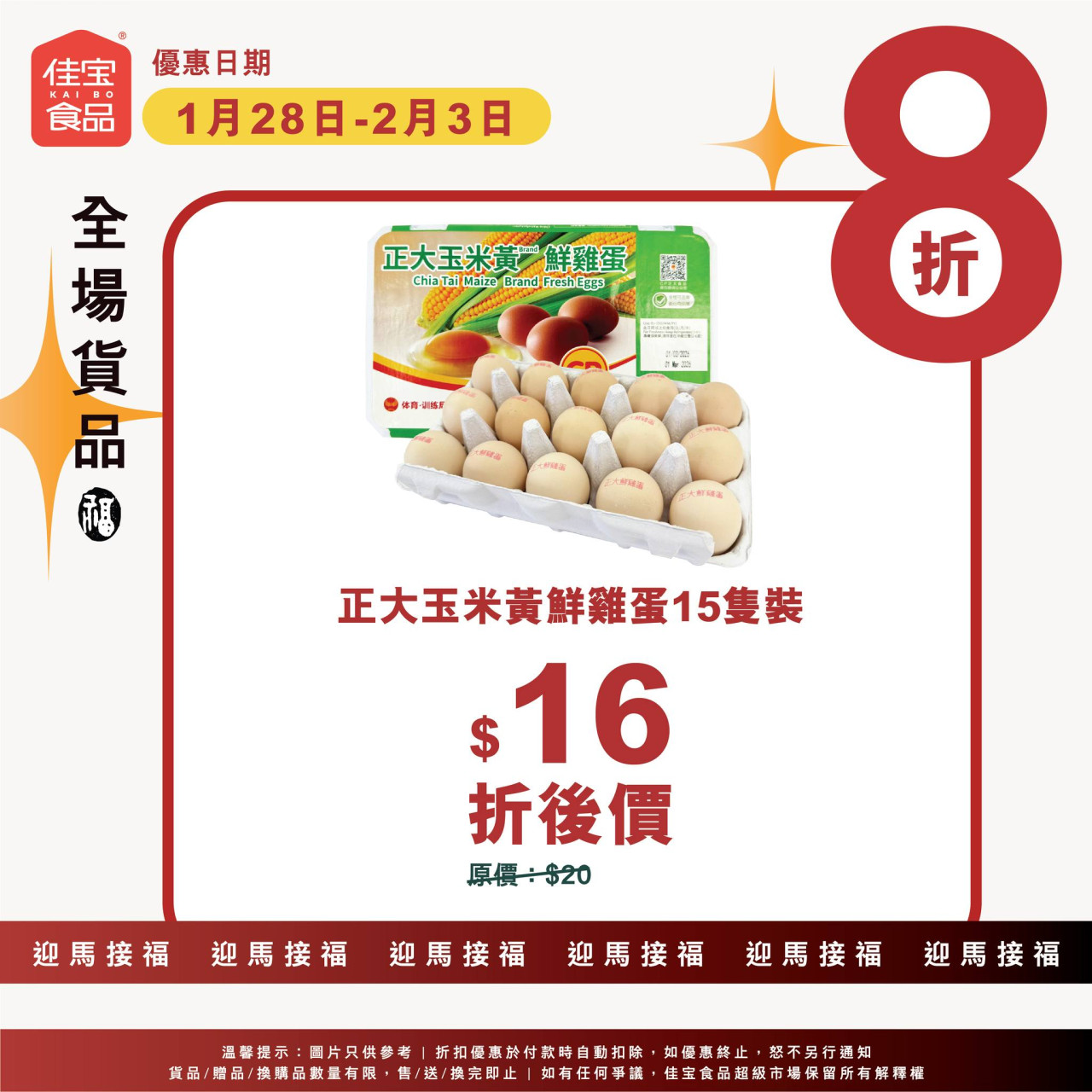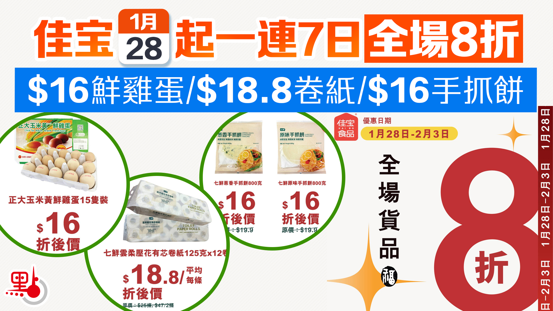 佳寶今起一連7日全場8折 $16鮮雞蛋/$18.8卷紙/$16手抓餅