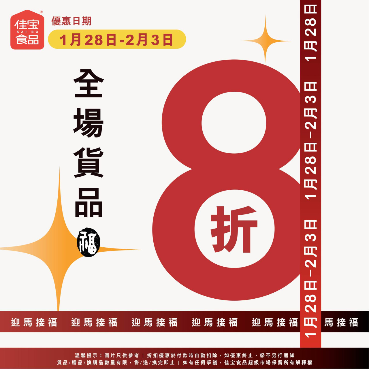 【點新聞報道】佳寶食品超級市場宣布推出極具誠意的「快閃優惠」,一連7日(1月28日至2月3日)舉行全場8折大激減。