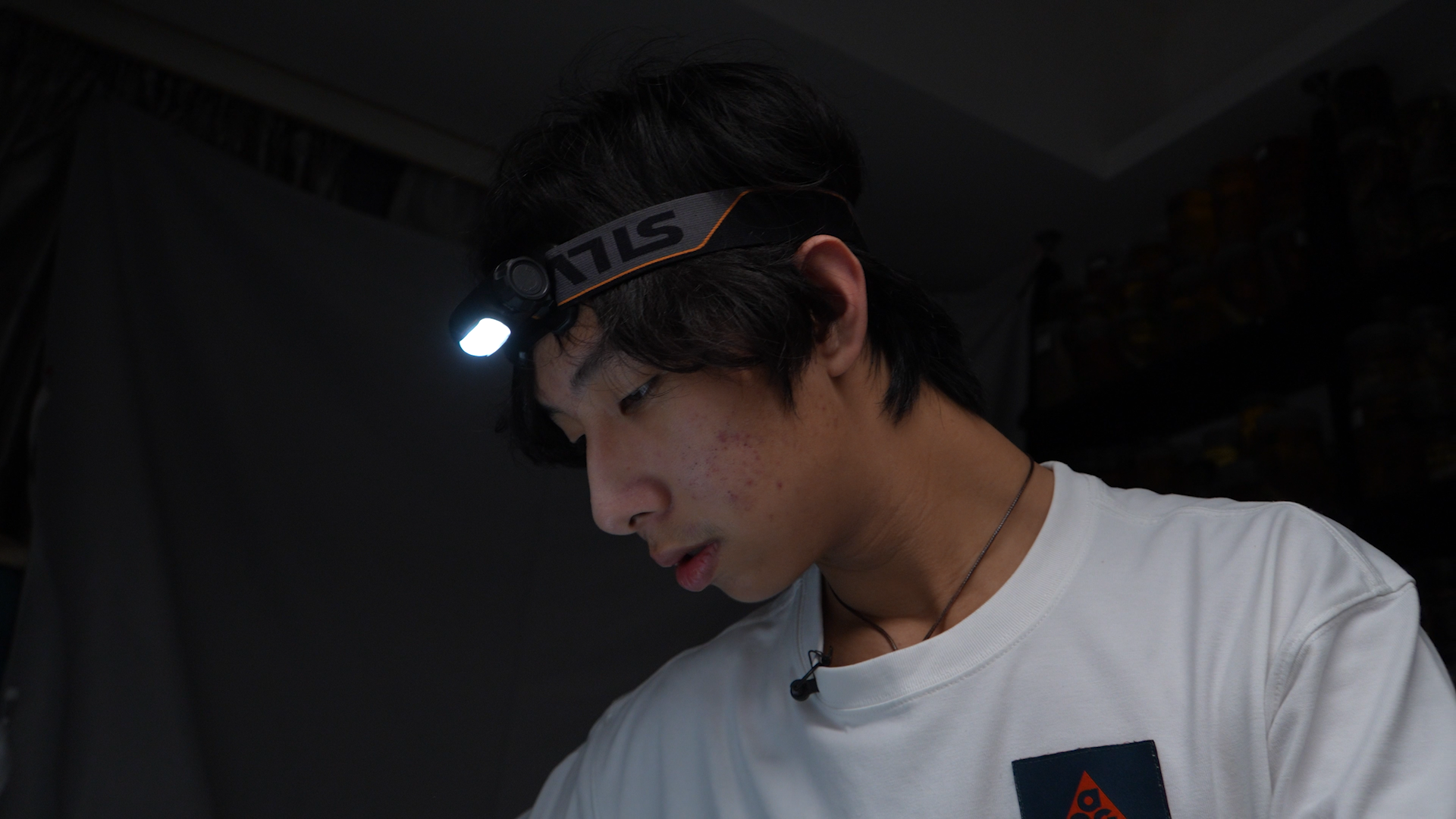 在這位「追魚少年」的身後,則是一整面牆的魚標本,那些大大小小、形態各異的魚浸泡在數不清的瓶瓶罐罐中,折射出暖黃色的光影,佔滿了整個房間,在玻璃與液體間流轉、折射,讓房間彷彿沉在海底。而這些,都是由這位燙着捲髮、高挑纖瘦的高中生親手製作,每一瓶都是他如數家珍的寶貝。