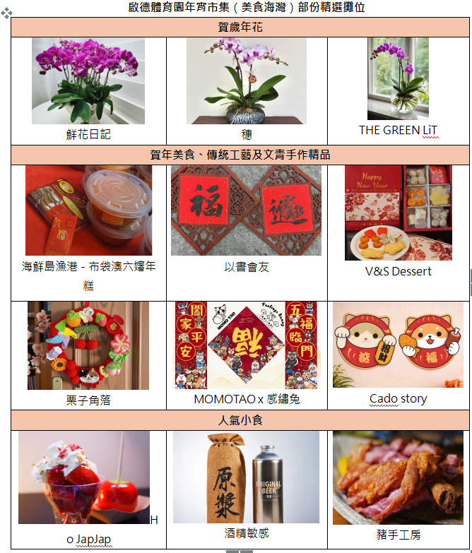 2月10至16日期間,體育園將迎來園區內最大型年宵市集活動,各式主題年宵市集從啟德零售館室內延伸到戶外美食海灣,一連7日熱鬧不斷。啟德零售館將化身為室內年宵市集,匯聚琳瑯滿目的應節商品及多個新春限定店。在室外,逾30個攤位將在美食海灣亮相,為大家搜羅林林總總的年貨,由年花盆栽、手寫揮春等傳統飾品,以至文青手作、利是盲盒等超人氣新派玩意;由古早味賀年糕點、烤魷魚、糖果等懷舊小食,以至新派茶款雞尾酒、發財脆皮鹹豬手等人氣美食,應有盡有。此外,市集還設多個親子體驗活動,包括新年主題扭汽球、臉繪等,讓孩子盡情放電,家長盡情掃年貨。