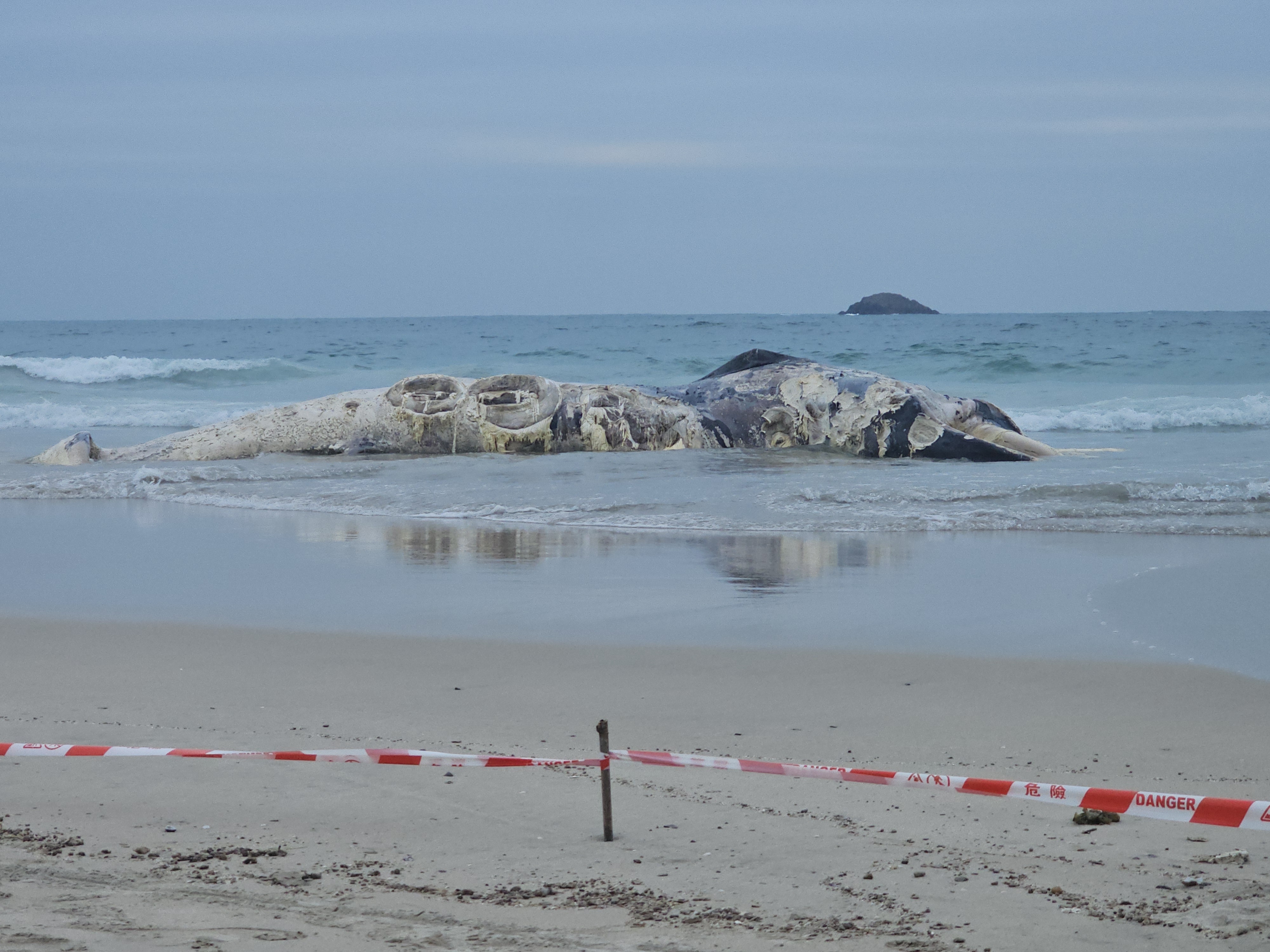 初步檢視顯示,屍體全長約11米,因嚴重腐爛,無法進一步解剖以確定死因。工作人員正盡快進行屍體棄置及現場清理工作,預計明日完成。其間,市民應避免前往該處,以免妨礙屍體棄置工作並造成危險。漁護署預計,該條死亡鯨魚並非本地物種,初步估計其屬於鬚鯨(Baleen whale)。根據屍體的腐爛程度,估計已死亡一段時間,相信是從外海隨水飄流至該水域。