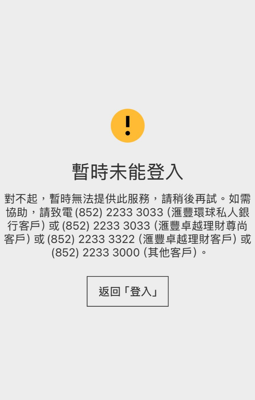 【點新聞報道】滙豐銀行的手機應用程式「HSBC HK」今日(30日)下午出現「死機」情況,有部分用戶無法登入,手機頁面顯示「對不起,暫時無法提供此服務,請稍後再試」。