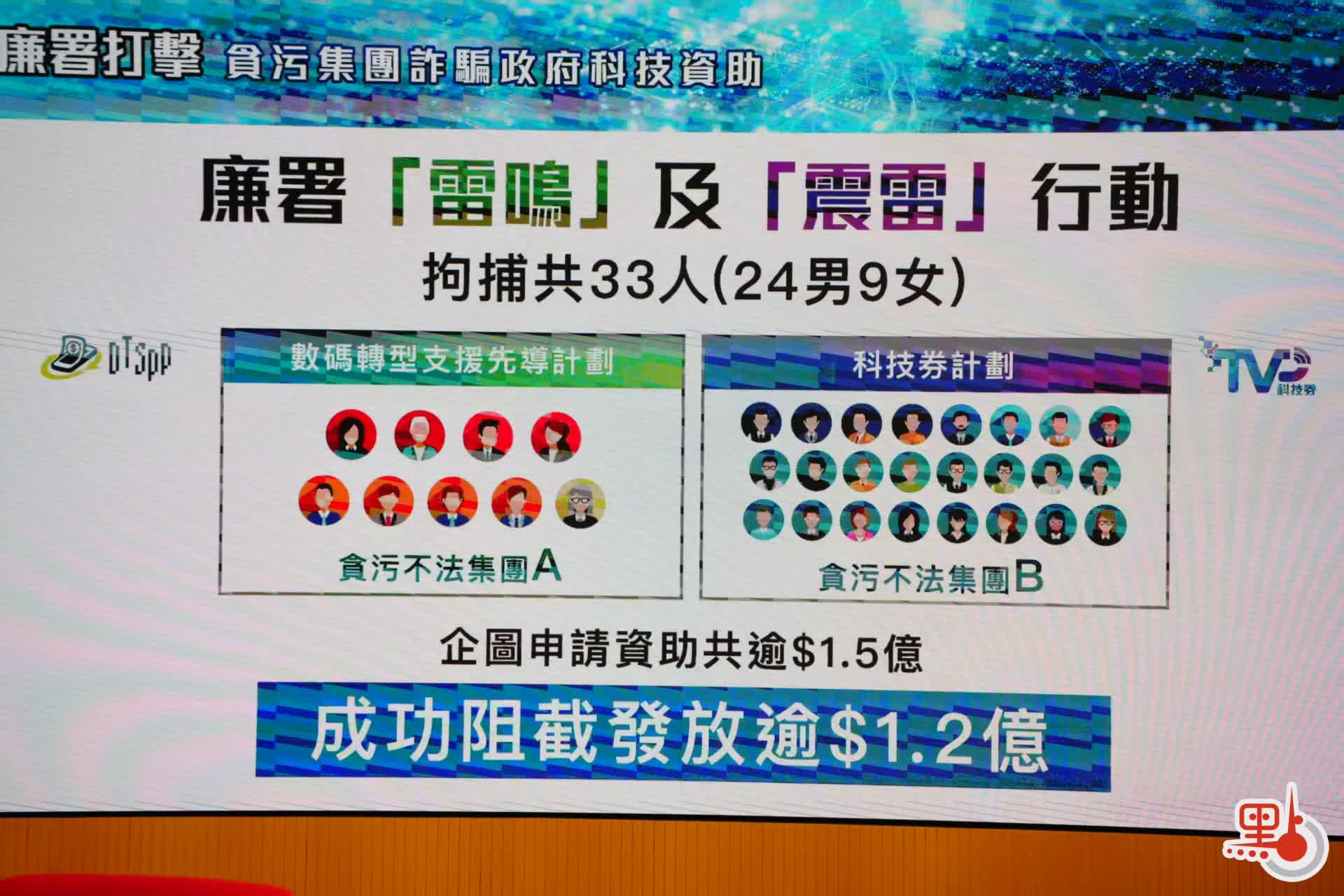 【點新聞報道】廉政公署(廉署)今日(30日)交代「雷鳴」和「震雷」兩大執法行動。廉政公署首席調查主任鄭礎明表示,廉署接獲投訴,指犯罪集團以貪污及欺詐手段詐騙政府科技資助,騙取公帑,謀取私利,涉及申請金額超過1.5億元,當中廉署成功截取逾1.2億元。