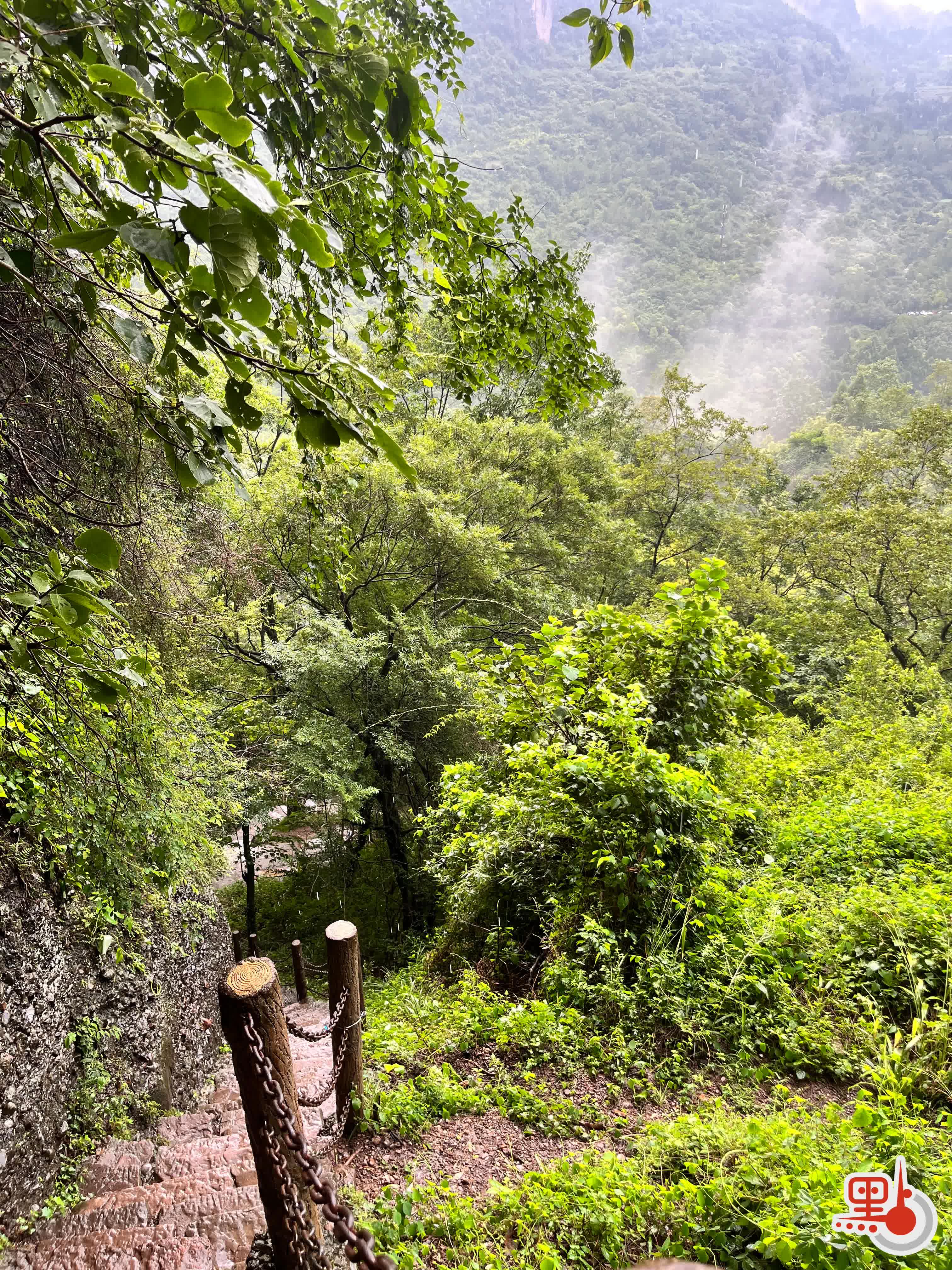 正想着,天色驟變。方才還明朗的晴天,轉眼就下起傾盆大雨,打濕了本已滑溜狹窄的石階。我正蹣跚攀爬一座高約80米的石筍峰,見雨勢洶湧,剛才還能看見遠處山脊的輪廓,轉眼就被雨線擦掉,能見度只剩前方二三十米,只得尋一塊稍微平坦的大石暫歇。當我撐着傘獨立於崖側,心裏竟生出幾分超然。