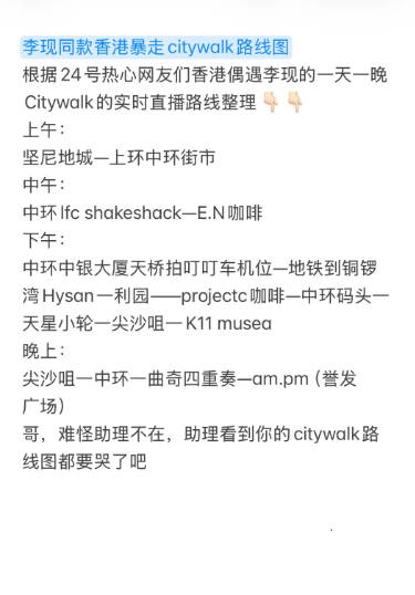 還有網友整理了李現的遊港路線,並指其路線適合體力強的攝影愛好者。