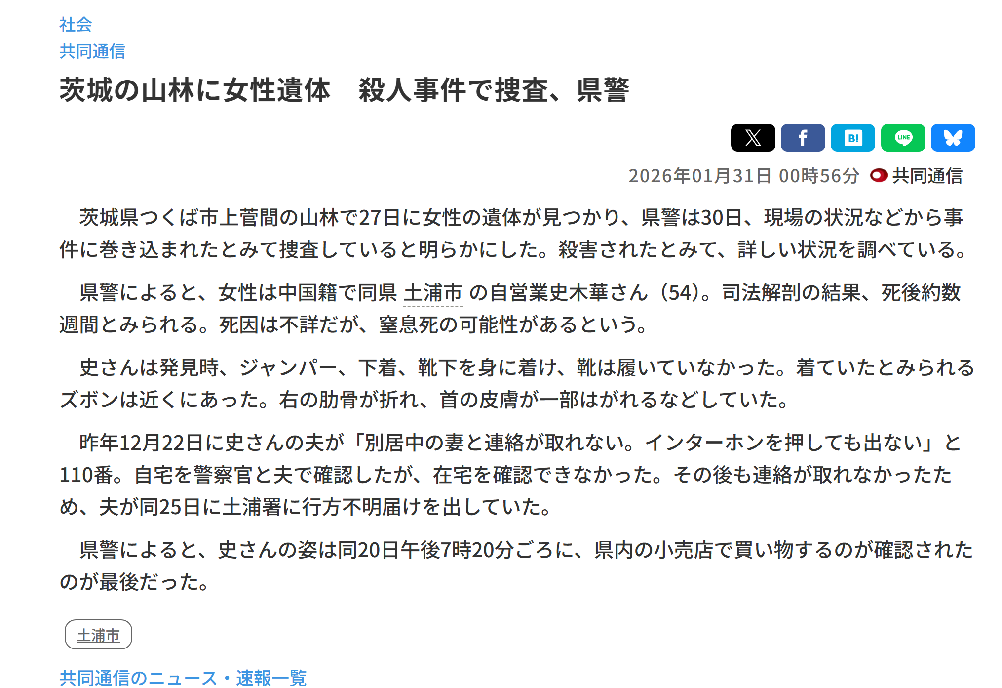 報道稱,警方透露,2025年12月底,死者丈夫報警稱與分居中的妻子失去聯繫,隨後向警方報案。警方確認,死者最後一次被看到是去年12月20日,當時她在茨城縣內一家零售店購物。警方正以謀殺案展開調查。