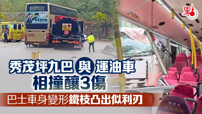 秀茂坪九巴與運油車相撞釀3傷 巴士車身變形鐵枝凸出似利劍