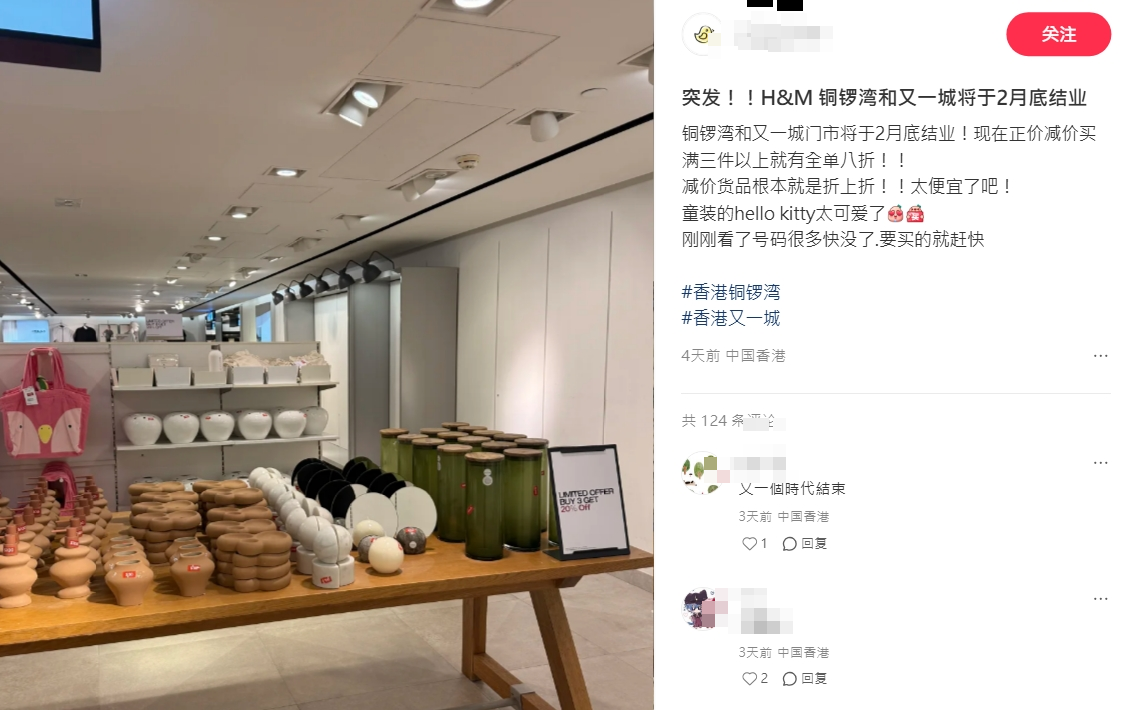 根據網民在社交平台小紅書上的分享,兩間分店目前正進行結業促銷,提供「正價減價貨品買滿3件以上即享全單8折」優惠。其中,又一城分店已張貼公告,表明「由於租約到期」,將於2月22日正式閉店。而H&M官方早前亦已證實銅鑼灣旗艦店因租約期滿,將於2月21日結束營業。