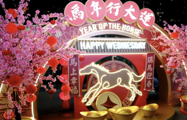 賽馬在香港已有近兩百年歷史,賽馬文化早已融入市民生活。對於不少市民來說,新春賽馬早已成為農曆新年期間的一項傳統活動,賽馬場亦逐漸演變成一家大小共聚同樂的節慶去處。今年適逢馬年,賽事中的駿馬與馬年生肖主題相互呼應,讓賽馬更添節日意義。跑馬地馬場G入口附近,一組以霓虹燈勾勒的奔馬打卡點,充滿濃厚新春氛圍。奔馬造型上面寫有「馬年行大運」、「YEAR OF THE HORSE」,寓意新春行好運。馬匹兩側懸掛春聯「瑞馬迎春」「馬上幸福」,周邊配上拱形燈飾、盛放桃花、紅燈籠與金元寶等賀年布置,象徵吉祥、幸福及財運,節日感十足。