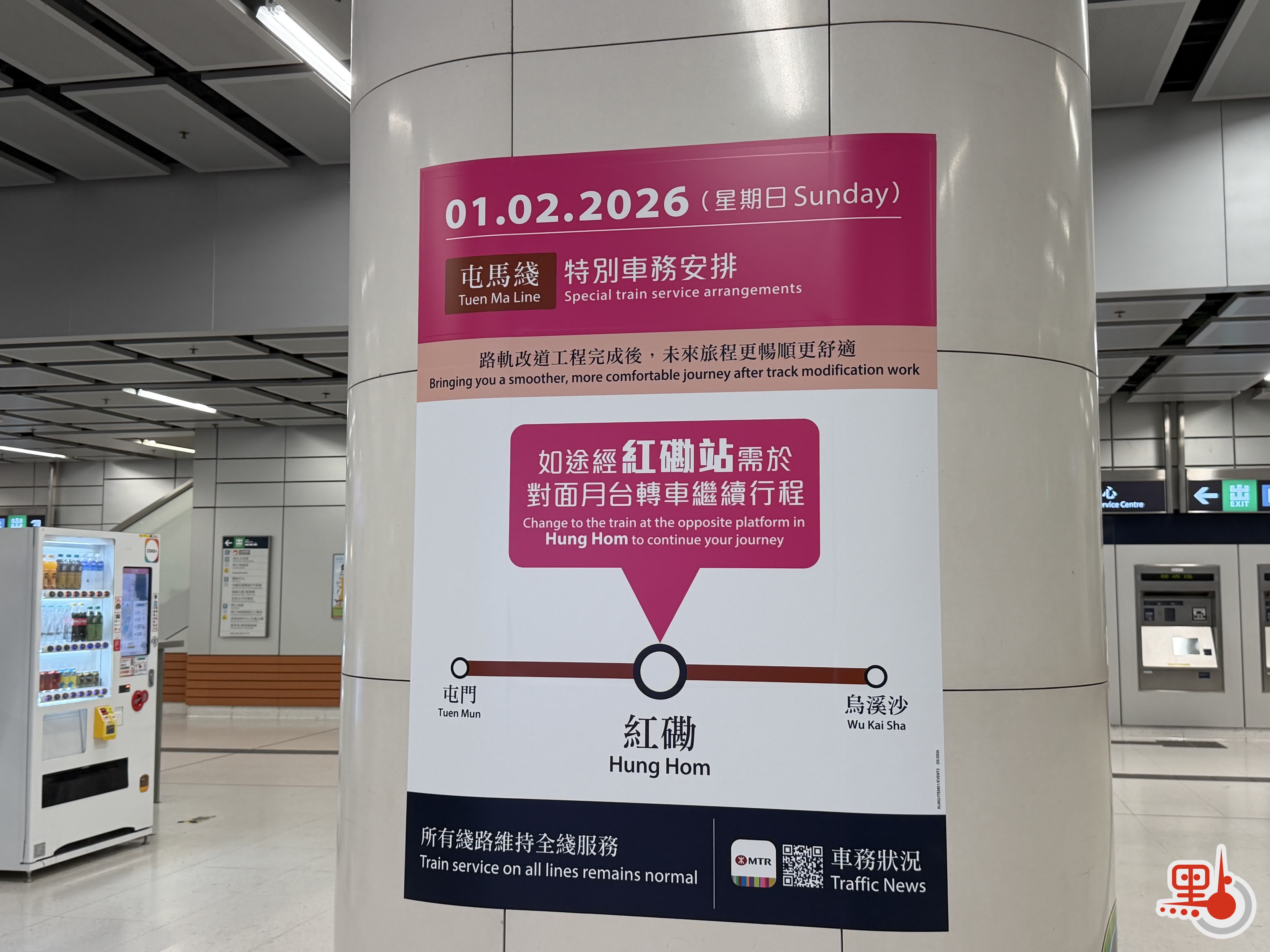 港鐵表示,屆時由烏溪沙站開出的列車將以紅磡站為終點站,之後折返烏溪沙站;由屯門站開出的列車同樣以紅磡站為終點站,之後折返屯門站。港鐵今日在紅磡站屯馬綫月台安排職員舉起大型指示牌,清楚標示列車行駛方向,方便乘客辨識;同時會加派超過150名職員在紅磡站及屯馬綫沿線車站提供協助。