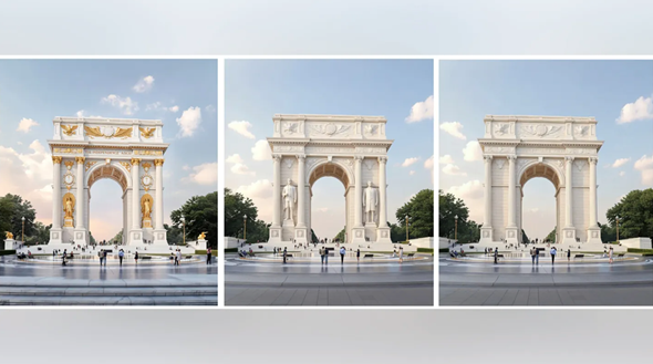 報道提到,特朗普去年年底就公開討論過相關構想,當時他說,為紀念美國獨立250周年而建造一座凱旋門式紀念碑的工程可能在兩個月內開始。他今年1月23日在其自創社交平台上分享了一系列古典凱旋門效果圖,引發新一輪猜測。這些圖片展示了多種設計方案,其靈感來源於法國巴黎凱旋門等歐洲古典風格拱門,以巨型柱體、寬闊中央開口和華麗細節為特色。
