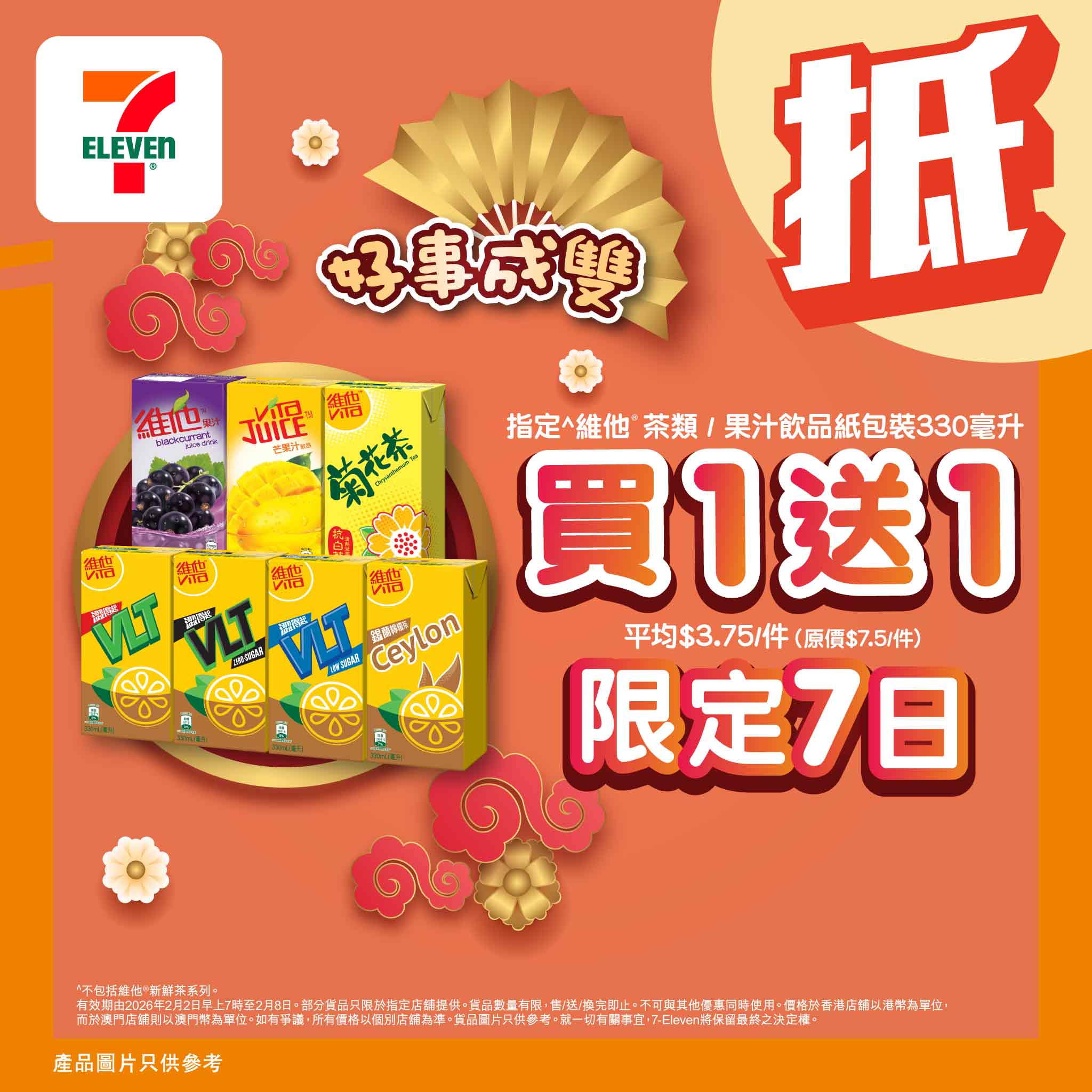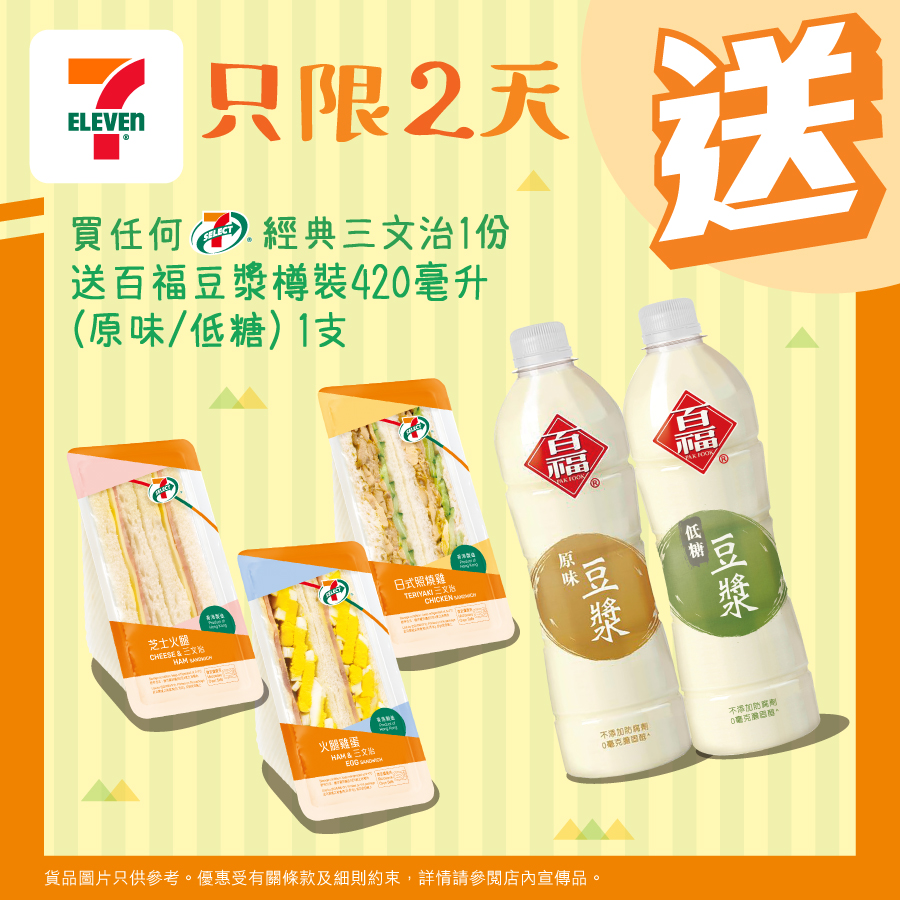 【點新聞報道】7仔又推限時優惠喇!即日(2月2日)起至2月8日,光顧7-Eleven購買指定維他茶類或果汁飲品紙包裝330毫升,即享買一送一優惠。今明兩日(2月2日至3日)購買任何7-SELECT經典三文治一份,即送百福豆漿樽裝420毫升(原味/低糖)一支。抓住優惠,快快掃貨吧!