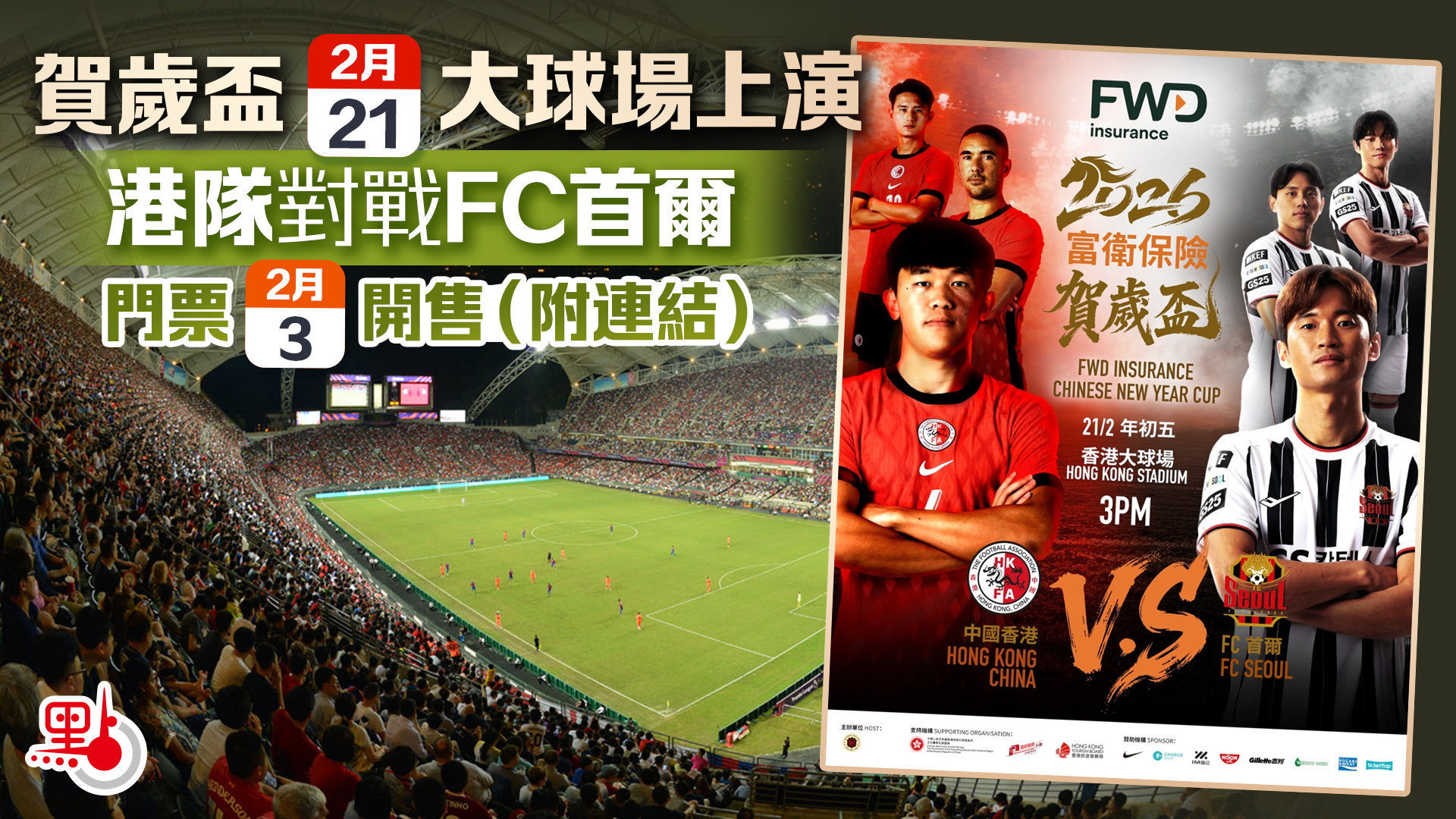 【點新聞報道】新春足球盛事強勢回歸!「FWD富衛保險賀歲盃2026」足球賽將於2月21日(大年初五)下午3時在香港大球場舉行,中國香港足球代表隊將迎戰韓國職業聯賽球會FC首爾。賽事門票今日(2月3日)下午3時於ticketflap發售。