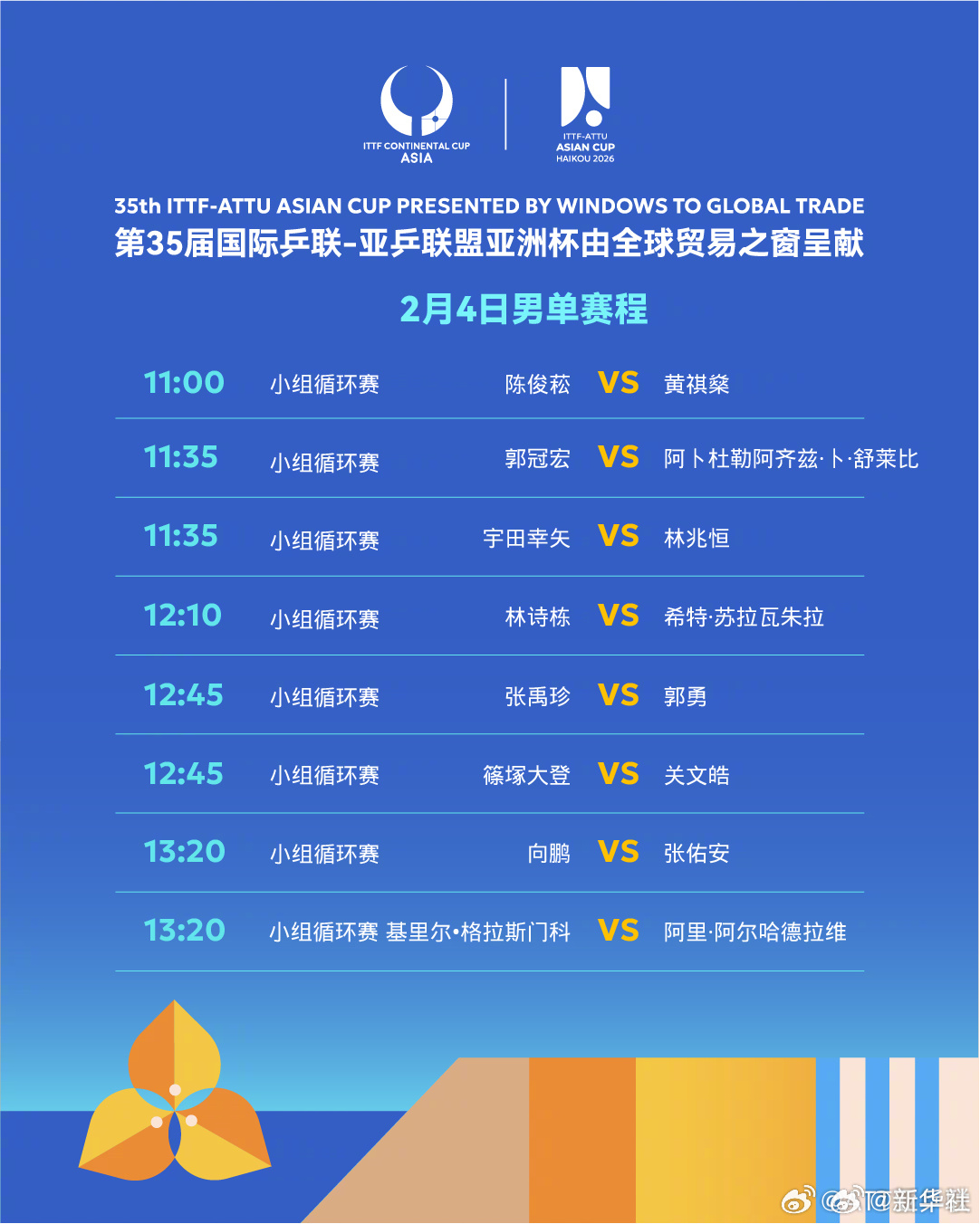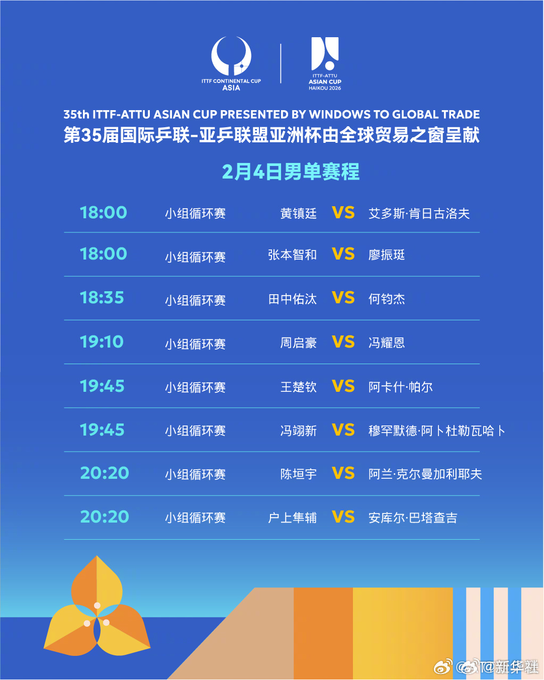 【點新聞報道】2月4日至8日,第35屆國際乒聯-亞乒聯盟亞洲盃將在海口五源河體育館舉行。明日(2月4日)為比賽首日,孫穎莎與王楚欽傷愈復出,各自出戰男單及女單賽程。孫穎莎上午11時對決中國台北乒乓球運動員葉伊恬,王楚欽晚上7時45分迎戰印度乒乓球運動員阿卡什·帕爾,期待他們的表現!