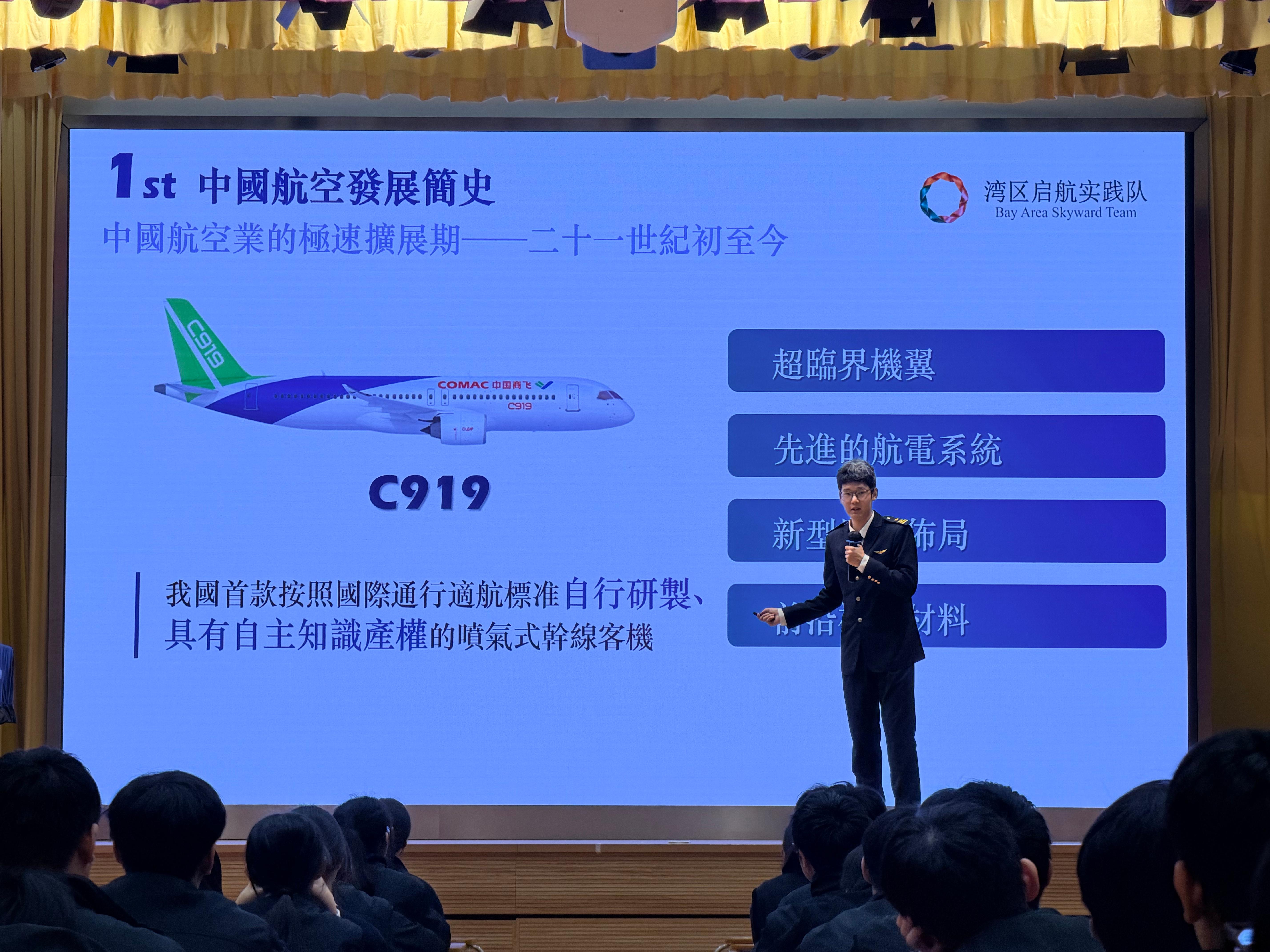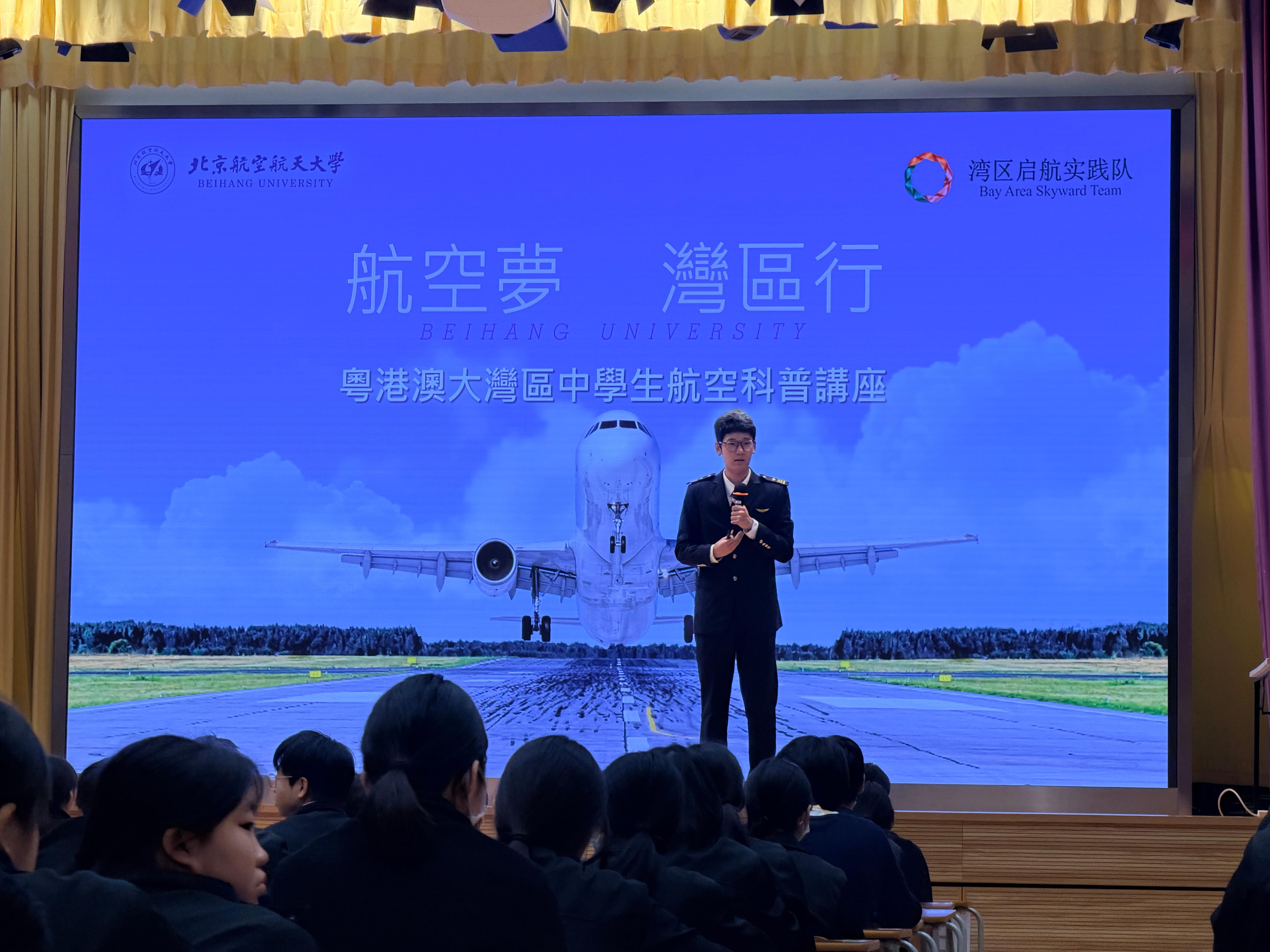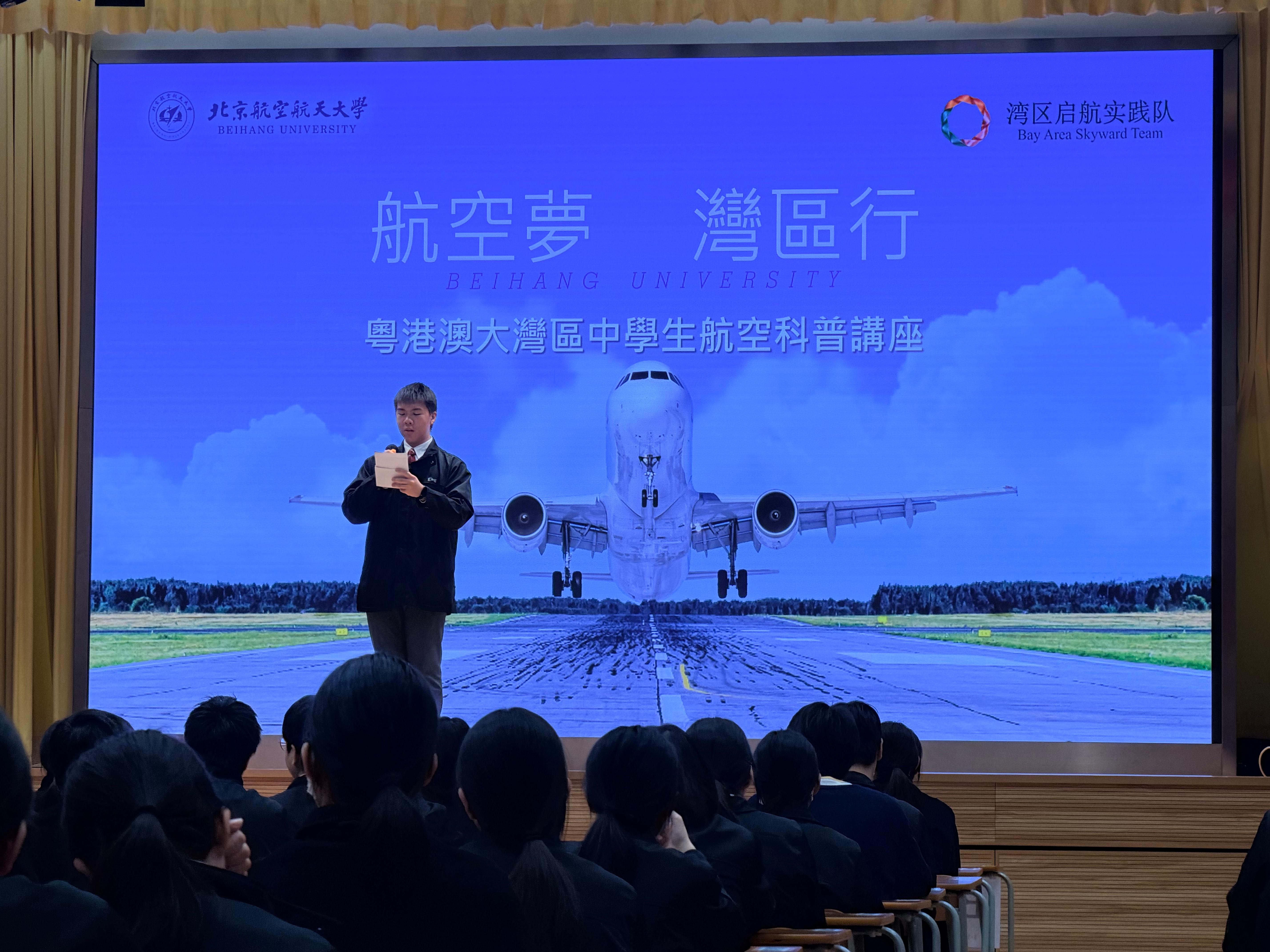 講座伊始,司儀莫梓文代表全校師生向促成此次活動的北航廖偉駿教授致以誠摯謝意,感謝他為兩地學子搭建起接觸國家頂尖航空文化與科研成就的橋樑。在全場大合照定格珍貴瞬間後,活動進入核心科普環節。司儀通過神舟飛船、北斗導航、C919 大飛機等國家重大航空航天成就的介紹,生動詮釋了「航空航天是國力體現」的深刻內涵,強調強大航空技術對維護國家主權與領空安全的戰略意義,引導大灣區青年樹立科技報國的責任意識。