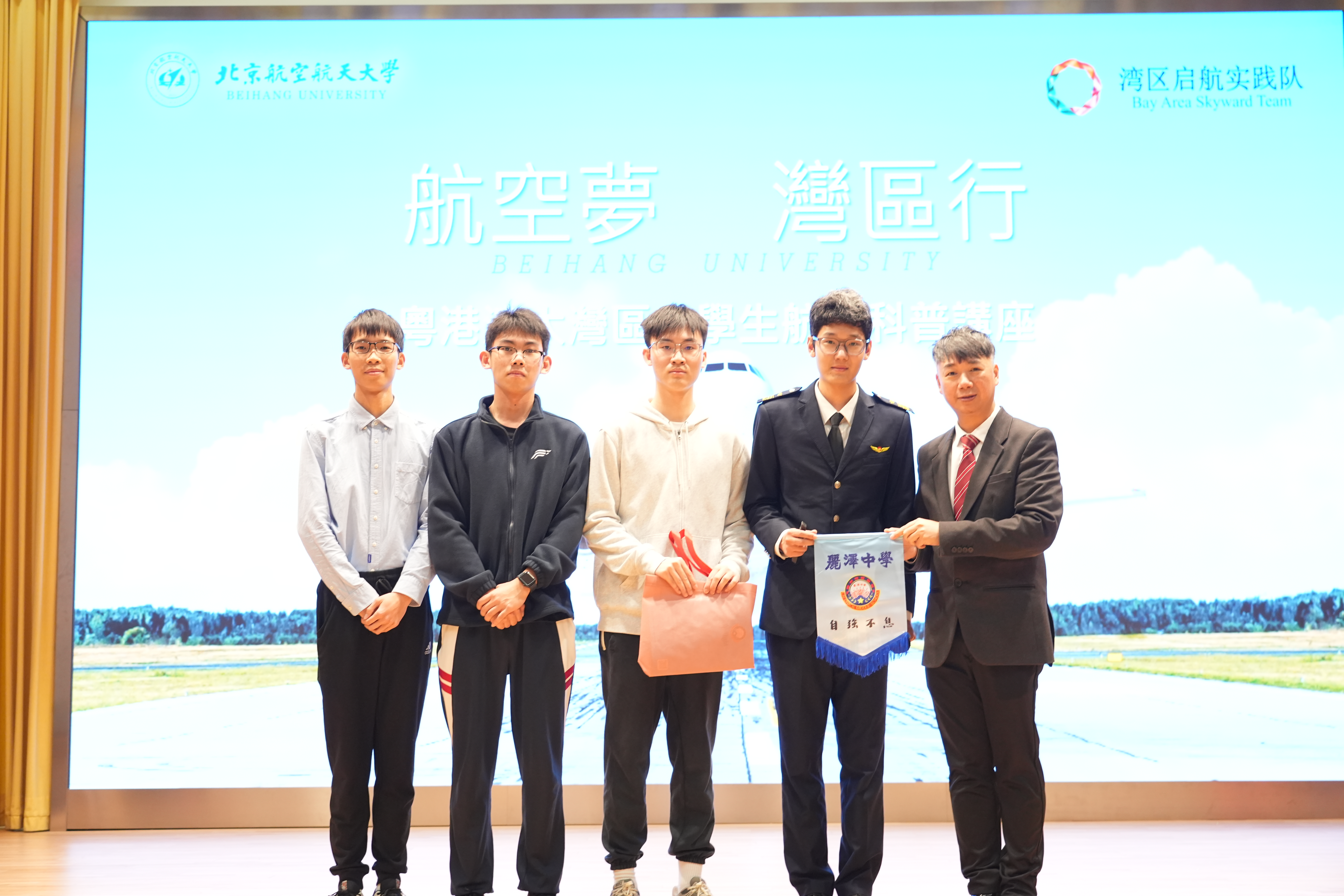 2026年1月27日下午,北京航空航天大學「灣區啟航實踐隊」走進香港麗澤中學,在學校禮堂成功舉辦「航空夢・灣區行」科普講座。來自北航的優秀學子鍾祺(隊長)、張屹航(主講師)、李明睿(助教)和梁晉豪(攝影師)任嘉賓主講,為現場師生帶來了一場兼具科技深度與家國情懷的航空知識,活動由麗澤中學中五甲班莫梓文同學擔任司儀,全程氛圍熱烈。
