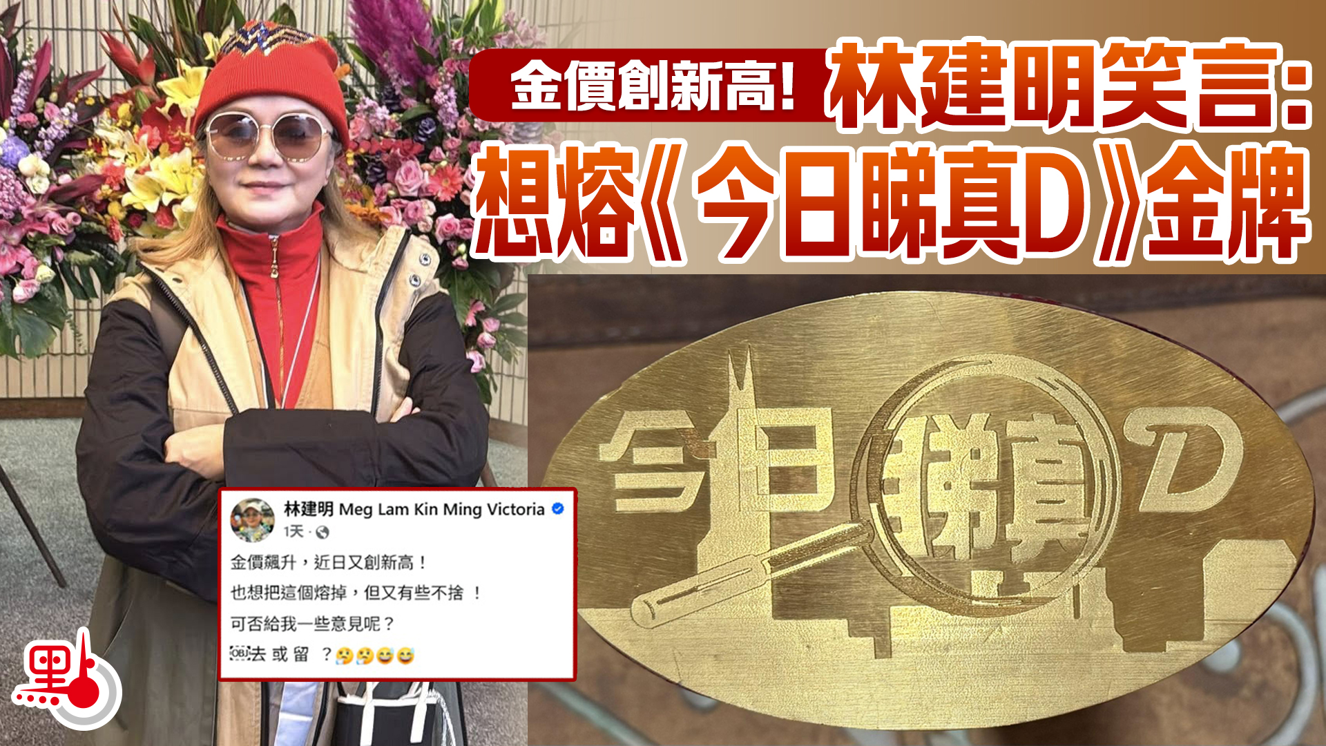 【點新聞報道】最近金價一路狂飆、屢破新高,不少人都心郁郁想出售珍藏的黃金套現。「大姐明」林建明日前在社交平台分享《今日睇真D》金牌,笑言想將其熔掉,但又有些不捨。帖文引發網民熱議,不少人都建議她保留金牌作留念。