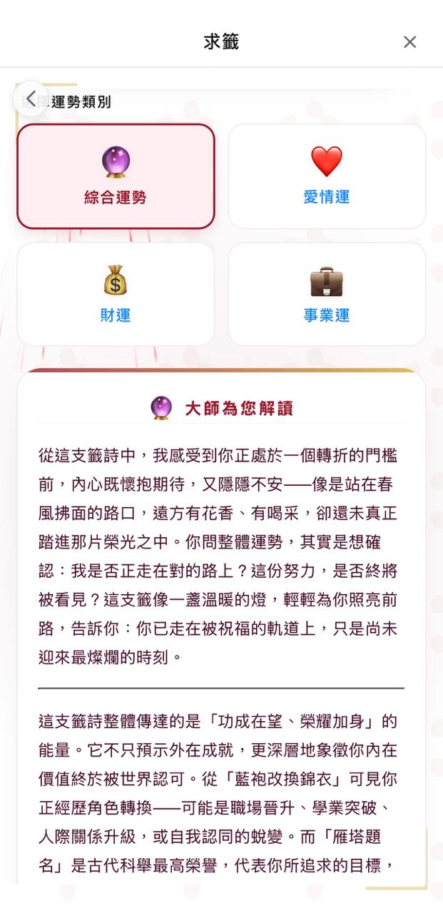 此外,點擊「大師深度解籤」,系統提供「綜合運勢」、「愛情運」、「財運」、「事業運」四大選項,由「AI大師」即時為您指點迷津。