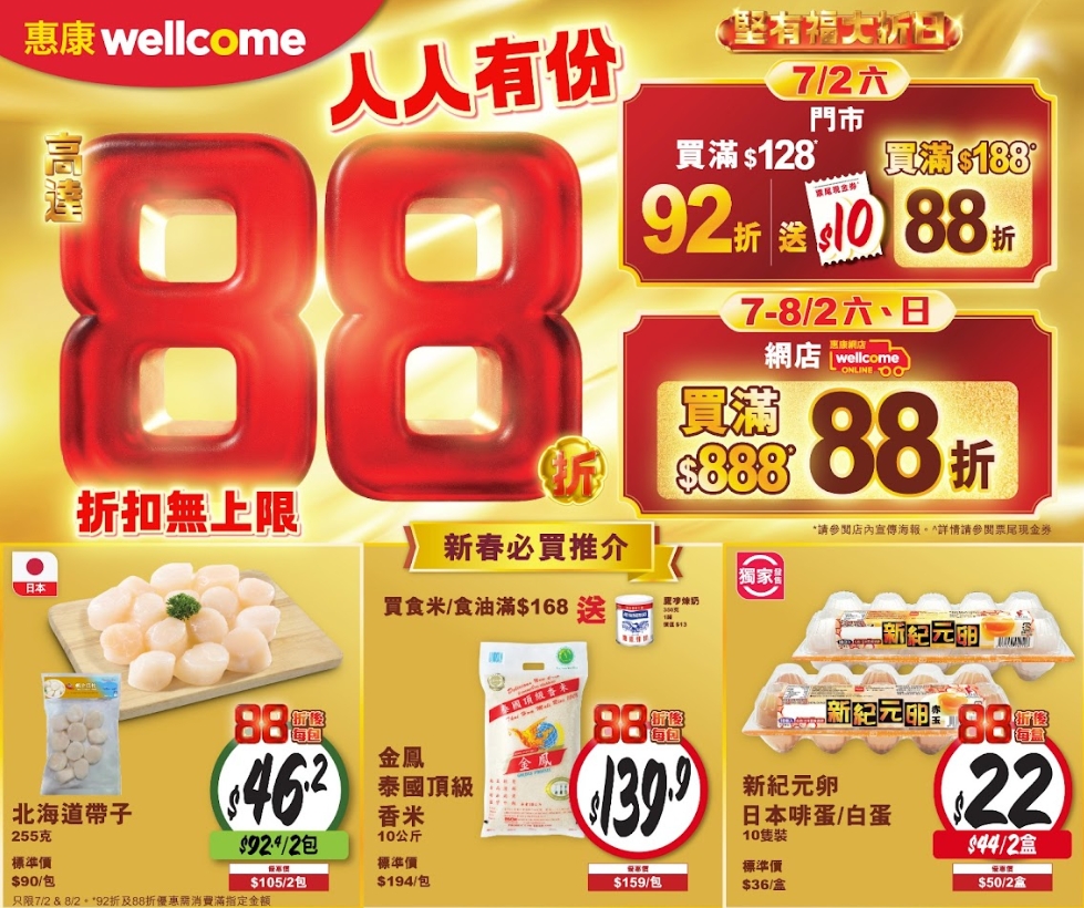 當日於全線惠康門市購物滿港幣128元,即可享92折,並獲贈10元票尾現金券一張(下次購物滿120元可使用);購物滿港幣188元,更可享88折優惠。網店同步推出折扣,購物滿港幣888元即享88折。