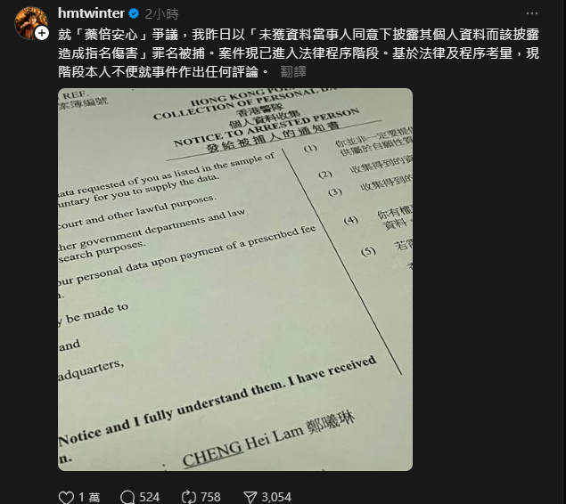 涉事城大學生鄭曦琳今日(6日)在社交平台發文指,其因「藥倍安心」事件,涉「未獲資料當事人同意下披露其個人資料而該披露造成指名傷害」罪名被捕,並在帖文中附上一張由警方發出的「發給被捕人的通知書」圖片。圖片顯示,通知書上清晰寫有其中、英文全名。她表示,因案件現已進入法律程序階段,基於法律及程序考量,她現階段不便就事件作出任何評論。