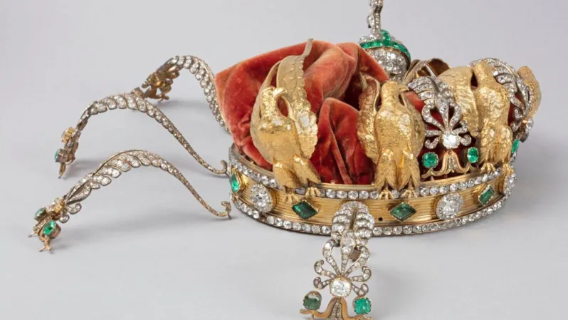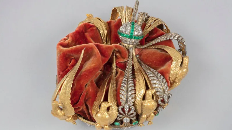 公告援引一份初步評估報告稱,皇冠可能是從展櫃豁口被強行取出時受到擠壓,隨後又遭猛烈撞擊而使框架變形。原皇冠上有8只金鷹飾件和8組鑽石與祖母綠構成的棕櫚葉飾件交替排列,目前缺失1只金鷹飾件和約10顆底座周緣小鑽。