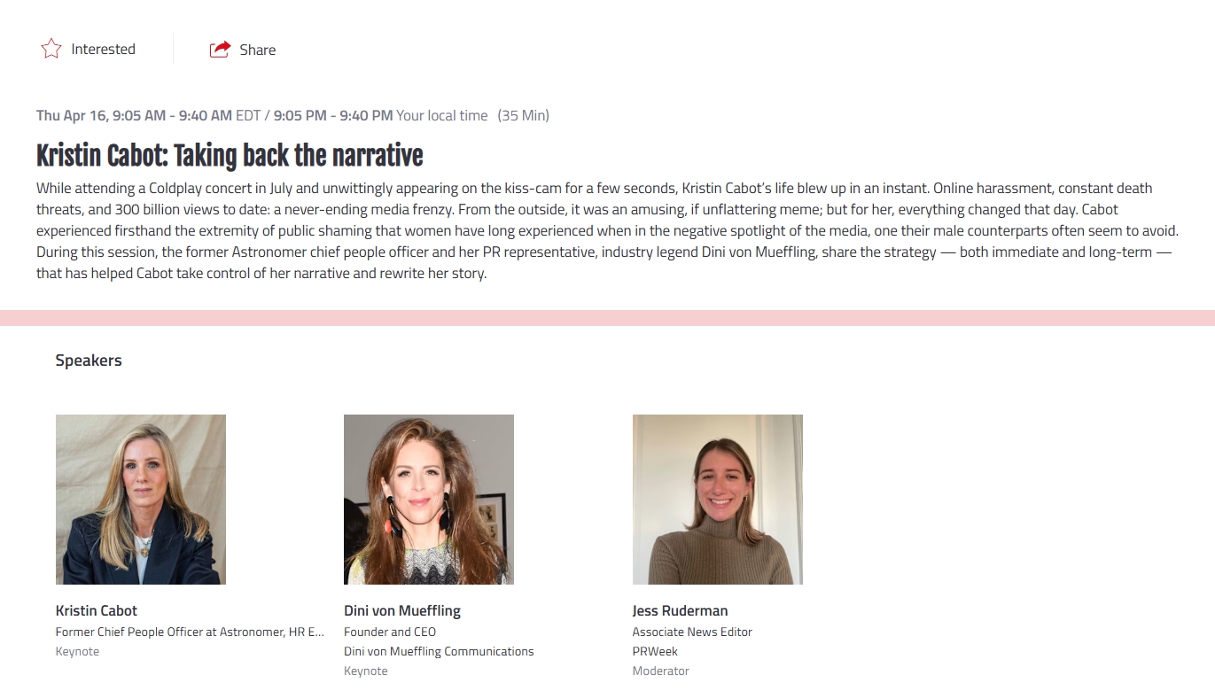 這一環節隸屬於《公關周刊》主辦的危機溝通大會,據大會官網信息,她的演講主題為《克里斯汀·卡伯特:奪回敘事權》。介紹中提到,卡伯特親身經歷了女性在媒體負面報道中長期遭受的極端公開羞辱,而男性同行似乎往往能夠避免這種遭遇。演講中她將以「反霸凌倡導者」的身份發聲,詳述自己為對抗「公開羞辱」所做的努力,致力於更深入地理解並改變這種文化現象——人們總不假思索、變本加厲地詆毀他人,而非選擇善意相待。大會介紹還提及,這起事件給卡伯特造成了精神創傷,事發後她一度閉門不出。