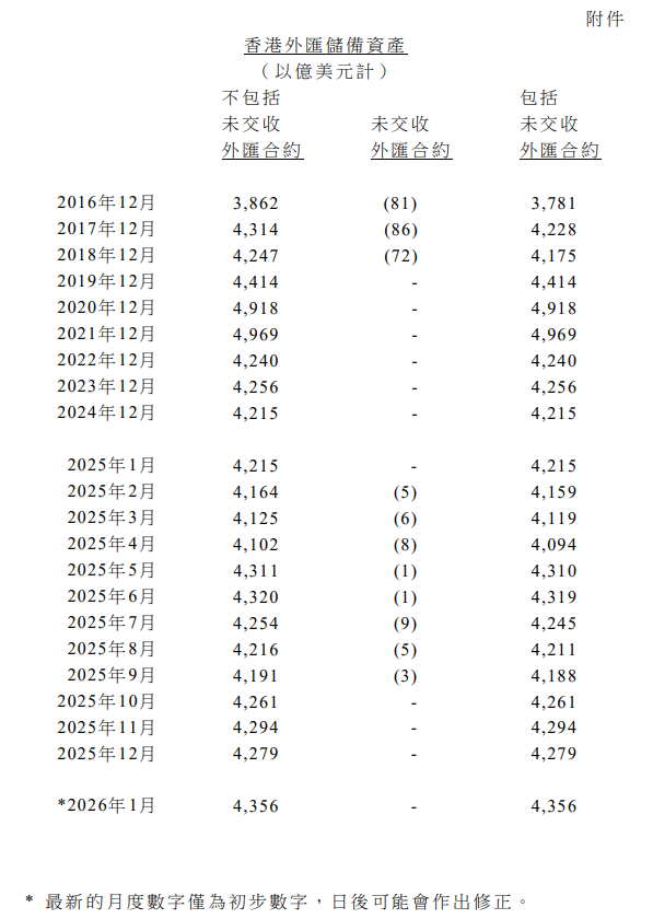 金管局表示,2026年1月底及2025年12月底並無未交收外匯合約。為數4,356億美元的外匯儲備資產總額,相當於香港流通貨幣5倍多,或港元貨幣供應M3約38%。