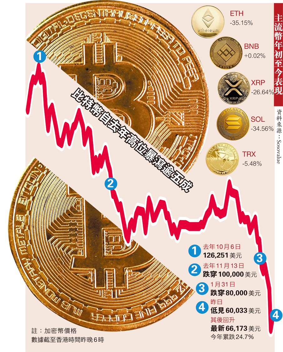 比特幣BTC昨晨一度跌至6萬美元,較去年高位約12.63萬美元大跌52%,截至昨日下午6點維持在6.5萬美元水平。資本市場評論期刊The Kobeissi Letter指出,自1月14日以來,加密貨幣市場市值已蒸發1萬億美元,22天內市值減少了1萬億美元,即每天平均減少450億美元。根據SoSoValue截至昨日數字,加密市場總市值為2.31萬億美元,較去年10月高位的4.38萬億美元蒸發了逾2萬億美元。