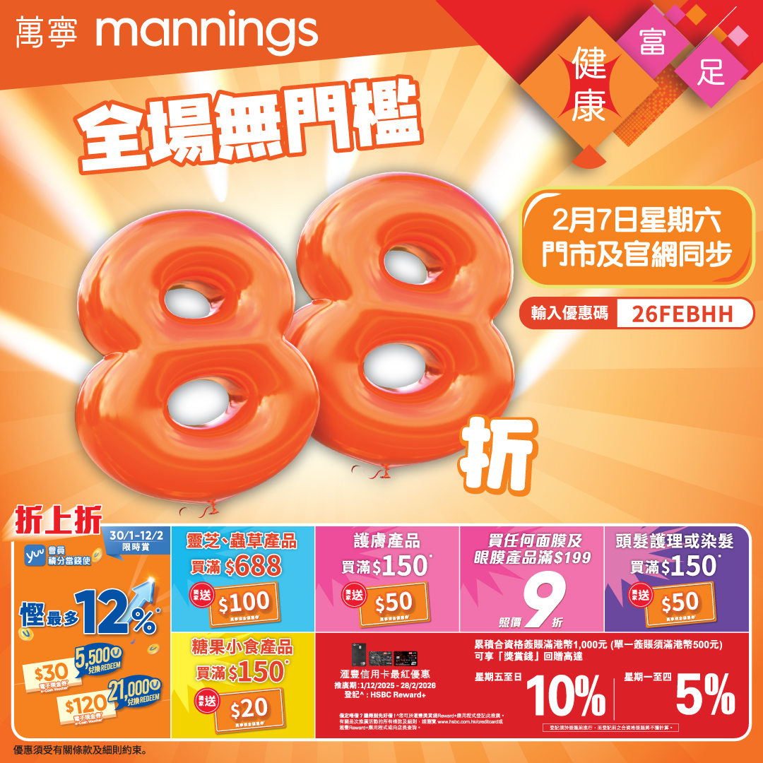 萬寧全場88折無論門市定網店,買保健品、護膚品通通無門檻88折!網店記得入優惠碼「26FEBHH」。教你終極「折上折」攻略:用yuu積分換現金券慳多12%,再用滙豐信用卡簽賬賺額外10%回贈。