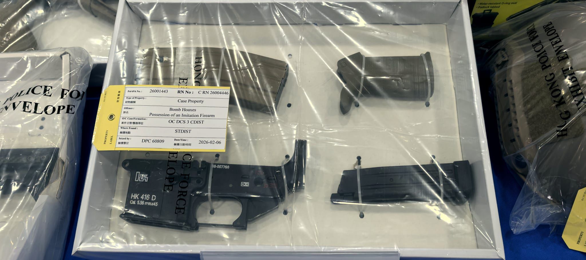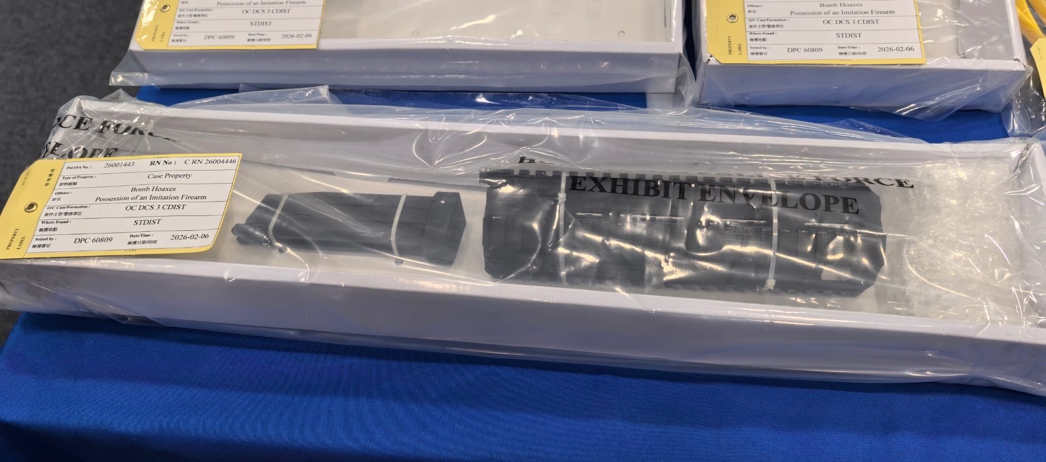 疑犯涉嫌「炸彈嚇詐」及「管有仿製槍械」被捕,目前被扣留調查,案件仍在調查中。警方提醒,炸彈嚇詐是一項嚴重罪行,一經定罪最高可被判處五年監禁。任何人管有仿製槍械,即屬犯罪,一經定罪,最高刑罰可處罰監禁三年。