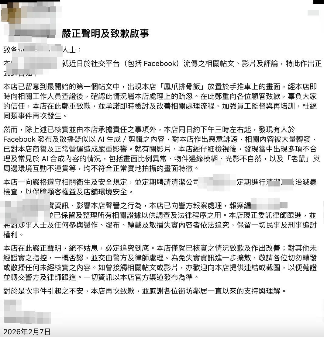 然而,事件在今日(7日)上午出現轉折。約10時許,涉事粉麵店於Facebook的「大埔街坊群組」中發布了一份「嚴正聲明及致歉啟事」,承認將蒸籠飯置於手推車上確屬管理疏忽,並就此向顧客致歉。但對於老鼠影片,店方指出片中出現「多項不合理且常見於AI合成內容的特徵」,懷疑影片經過人工智能生成或惡意剪輯,屬於不實指控,已構成誹謗。店舖表示已就事件報警處理,目前案件正由警方及律師跟進。