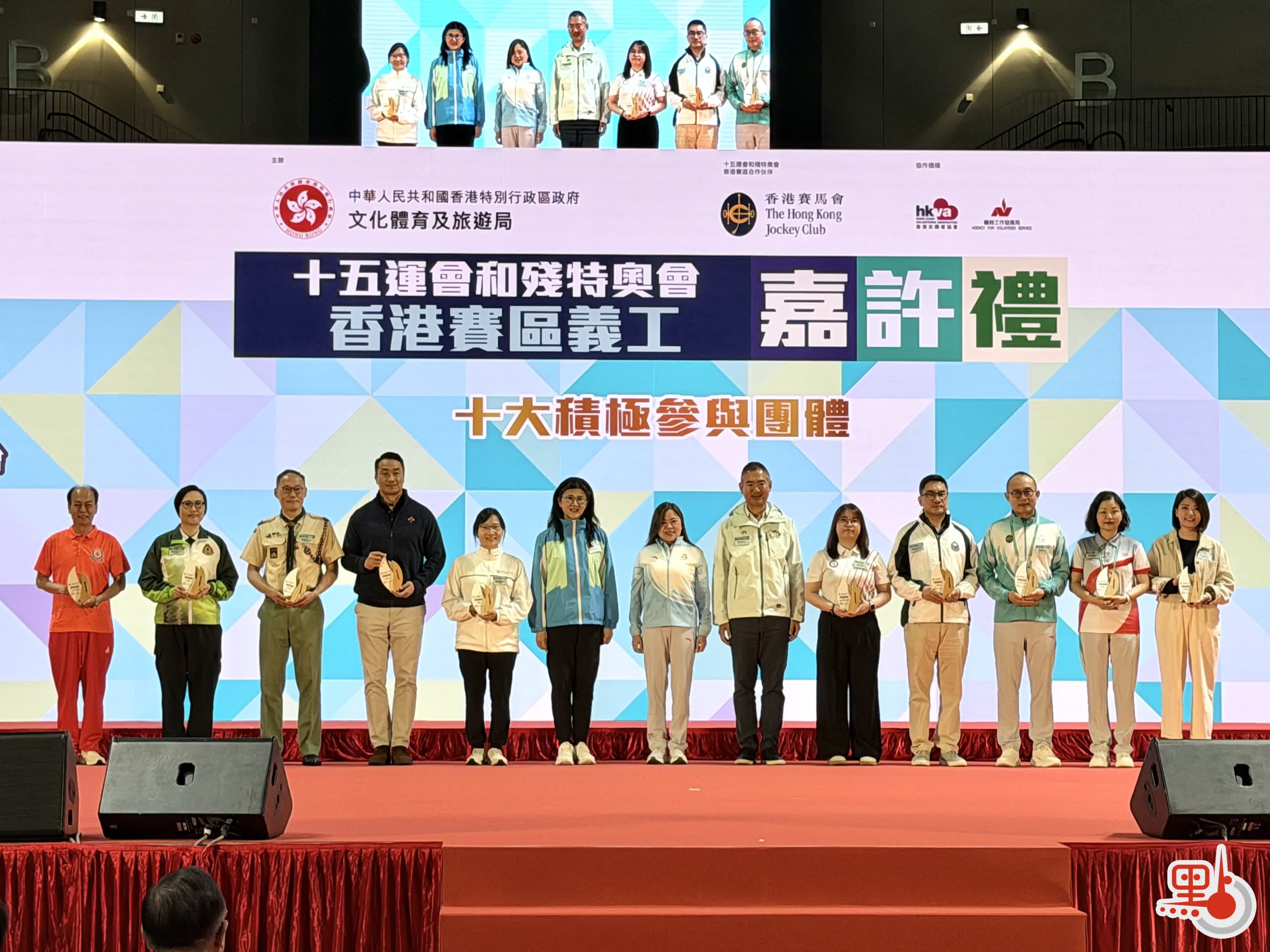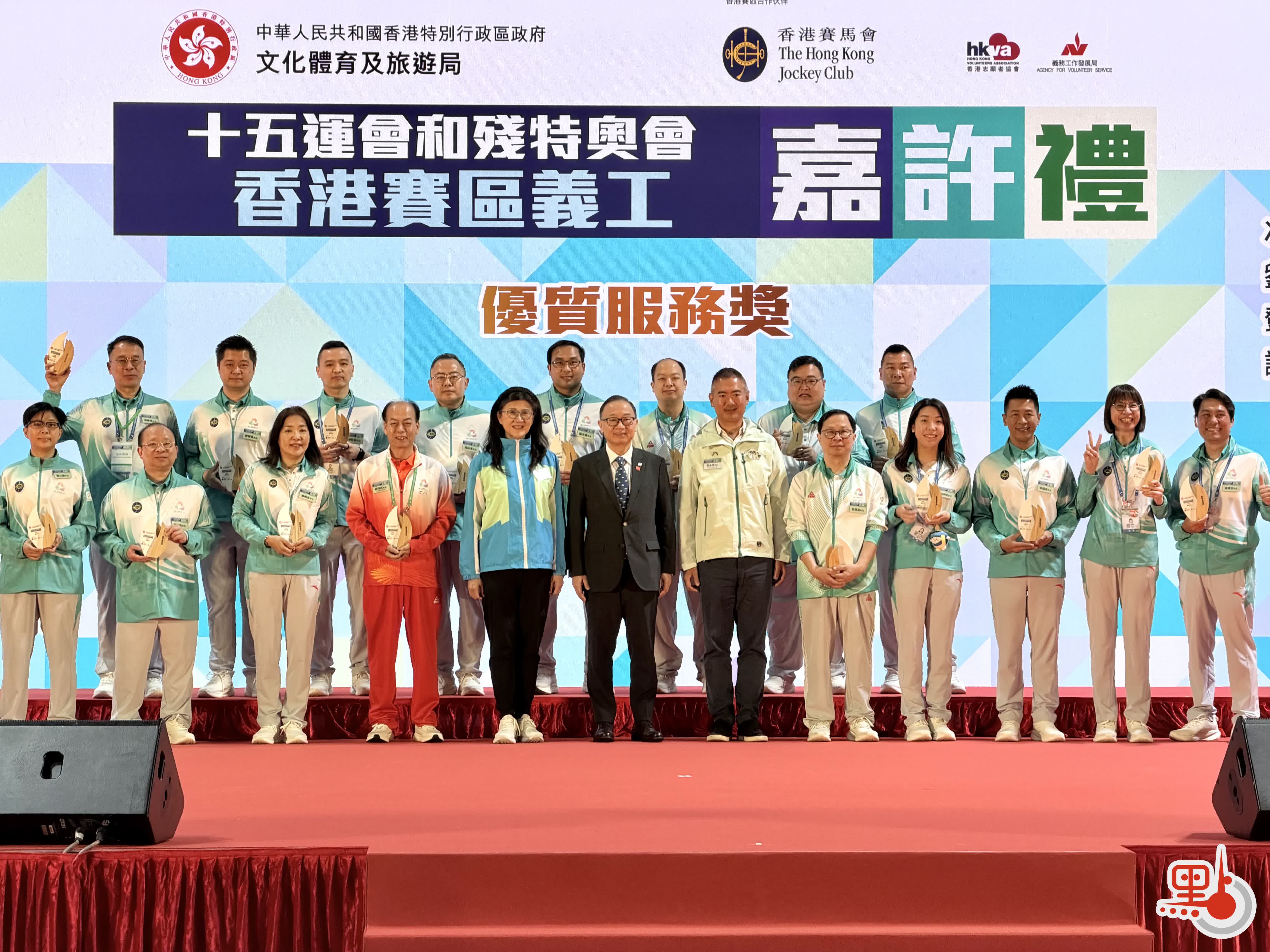 【點新聞報道】為表揚「第十五屆全國運動會香港賽區義工計劃」15,000名義工在十五運會和殘特奧會香港賽區的卓越貢獻,「十五運會和殘特奧會香港賽區義工嘉許禮」(嘉許禮)今日(7日)下午在香港單車館隆重舉行。政務司司長陳國基、香港賽馬會主席廖長江、文化體育及旅遊局局長羅淑佩等嘉賓出席活動。