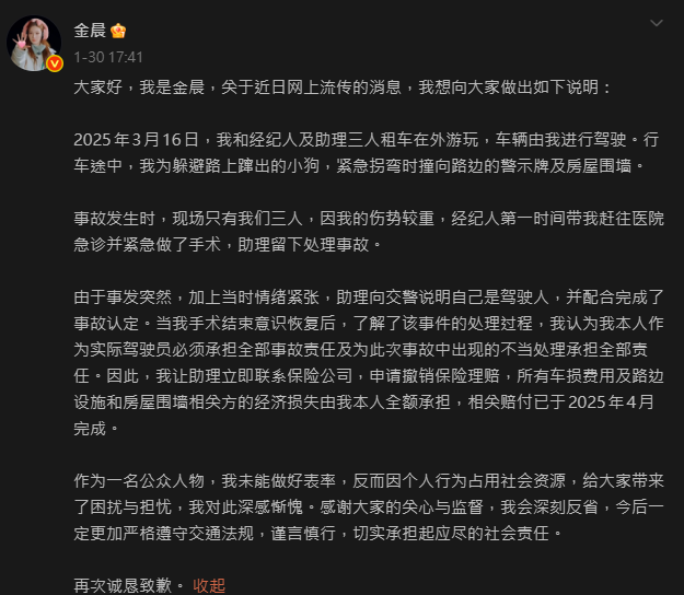 金晨事後在微博上就事故道歉,並表示,「當時由於事發突然,加上情緒緊張,助理向交警說明自己是駕駛人,並配合完成了事故認定。」金晨指,在手術結束意識恢復後,她了解了該事件的處理過程,並認為其作為實際駕駛員,必須承擔全部事故責任,並為事故中出現的不當處理承擔全部責任。